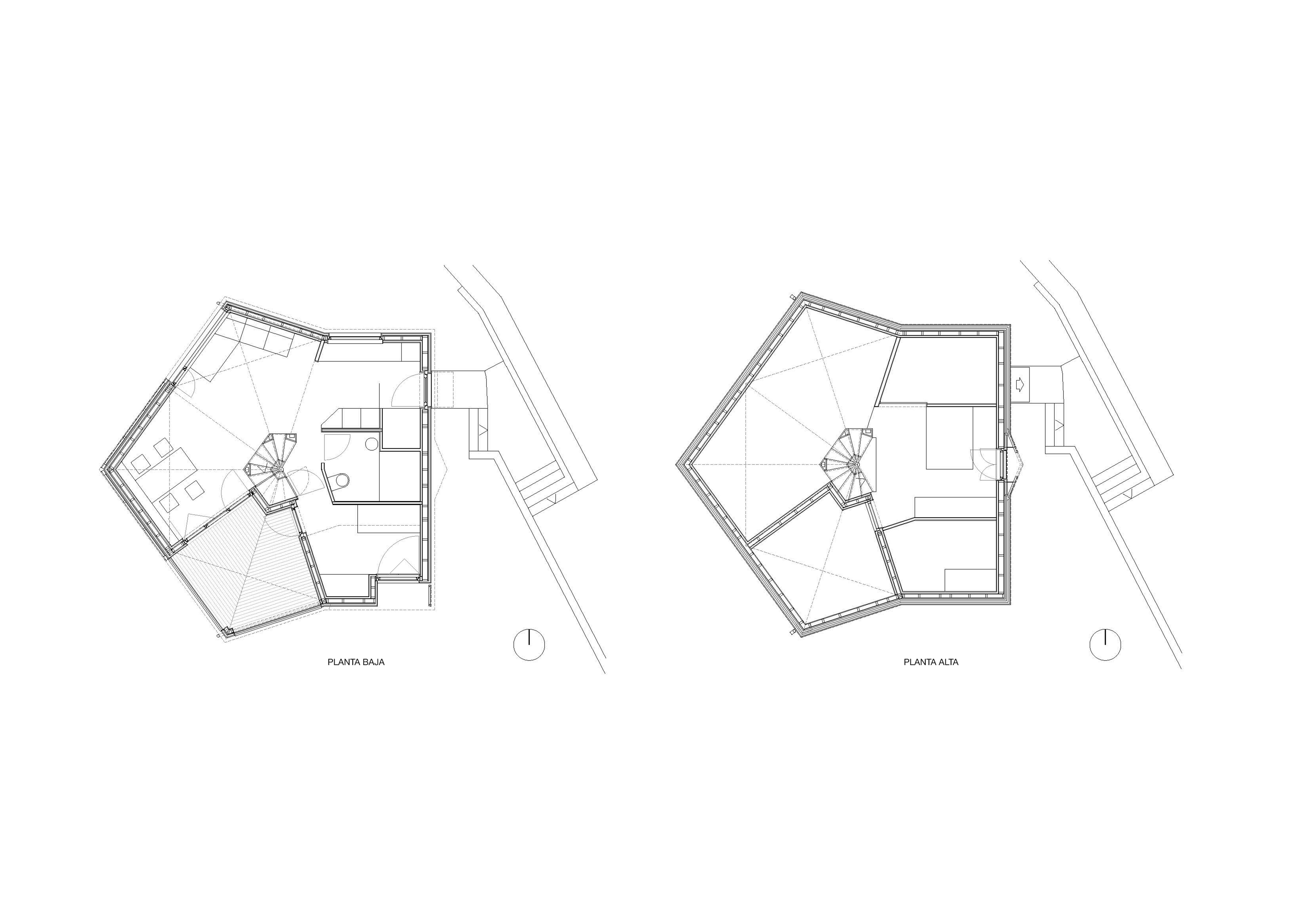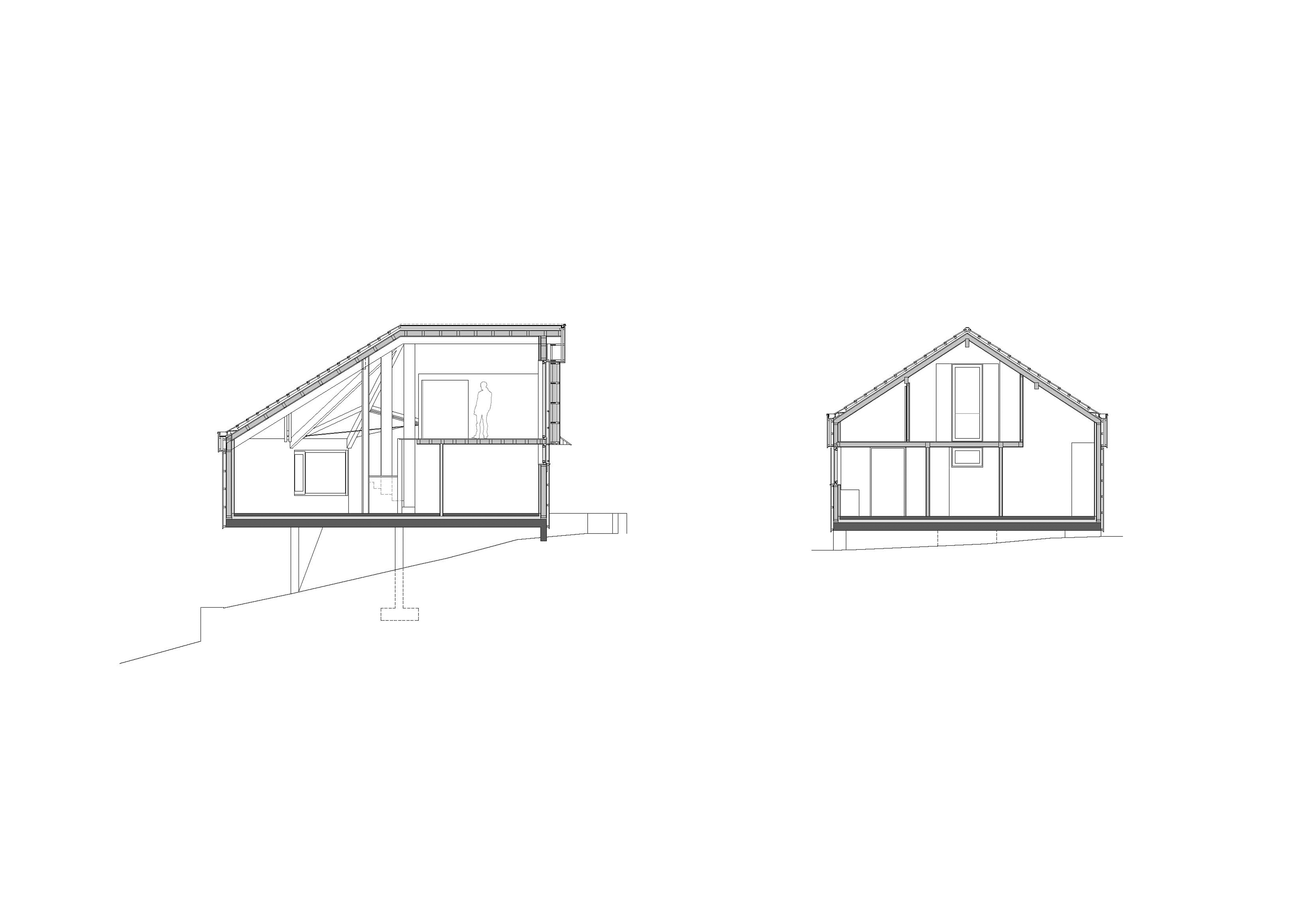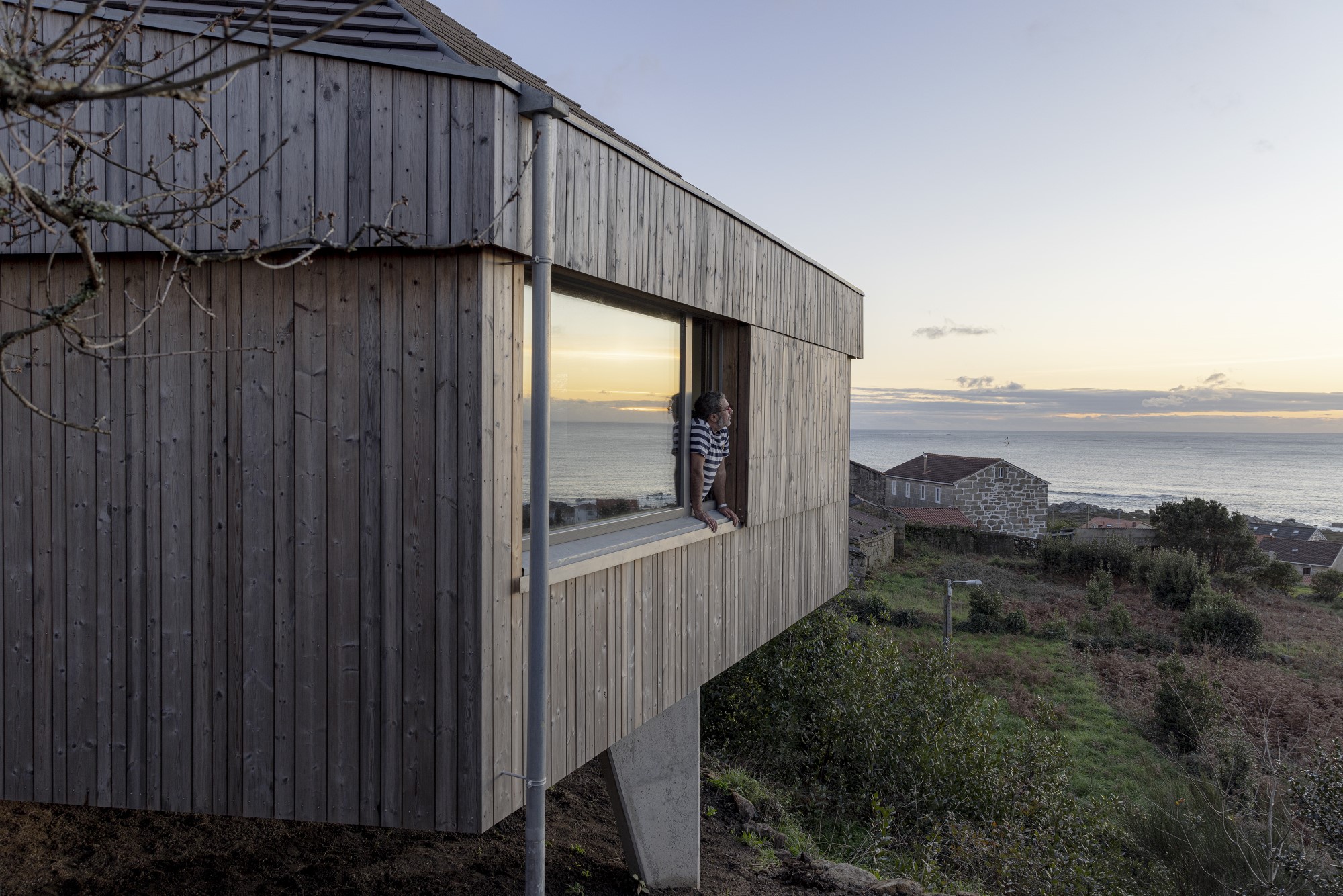 Una losa de hormigón se apoya sobre pantallas que reducen al mínimo su sección en el contacto con el terreno, posándose si alterar prácticamente su topografía y sorteando los muretes existentes. Ésta se encuentra con el terreno al este, elevándose sobre la copa de los árboles al oeste. Sobre ella, se resuelve una vivienda resuelta enteramente en madera.
