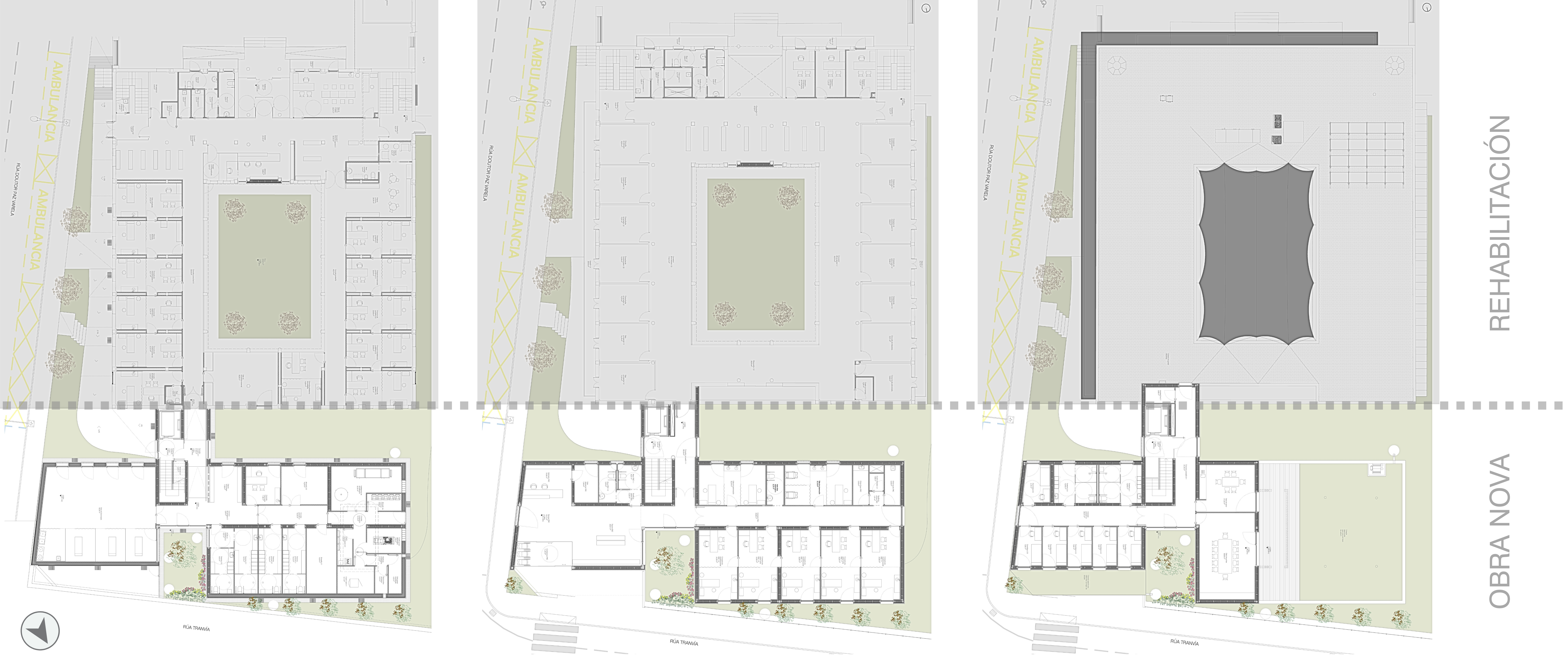 El nuevo edificio se sitúa al norte del existente, en la única zona disponible del solar. El suelo en el que se va a construir tiene una fuerte pendiente, de manera que su planta baja, coincide con la planta primera del Centro de Salud.
