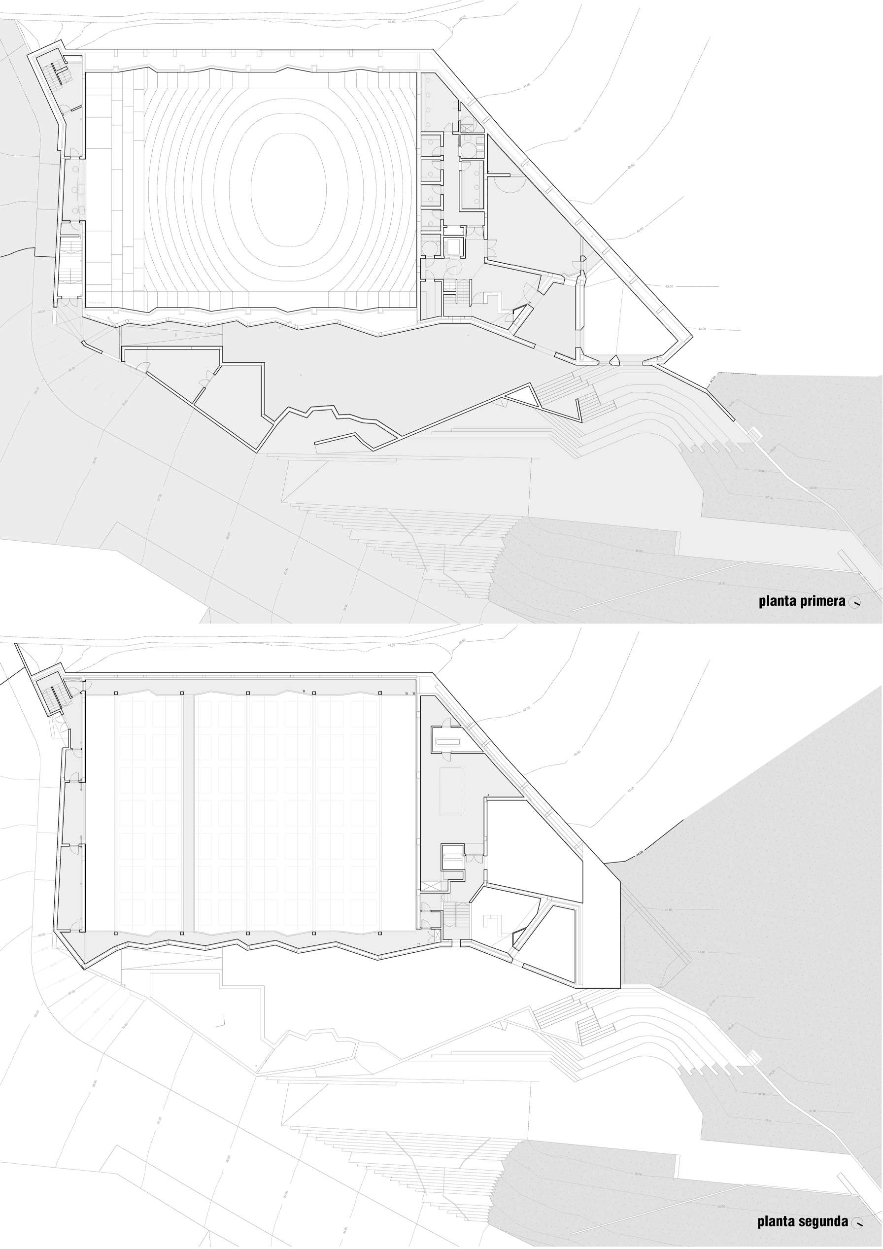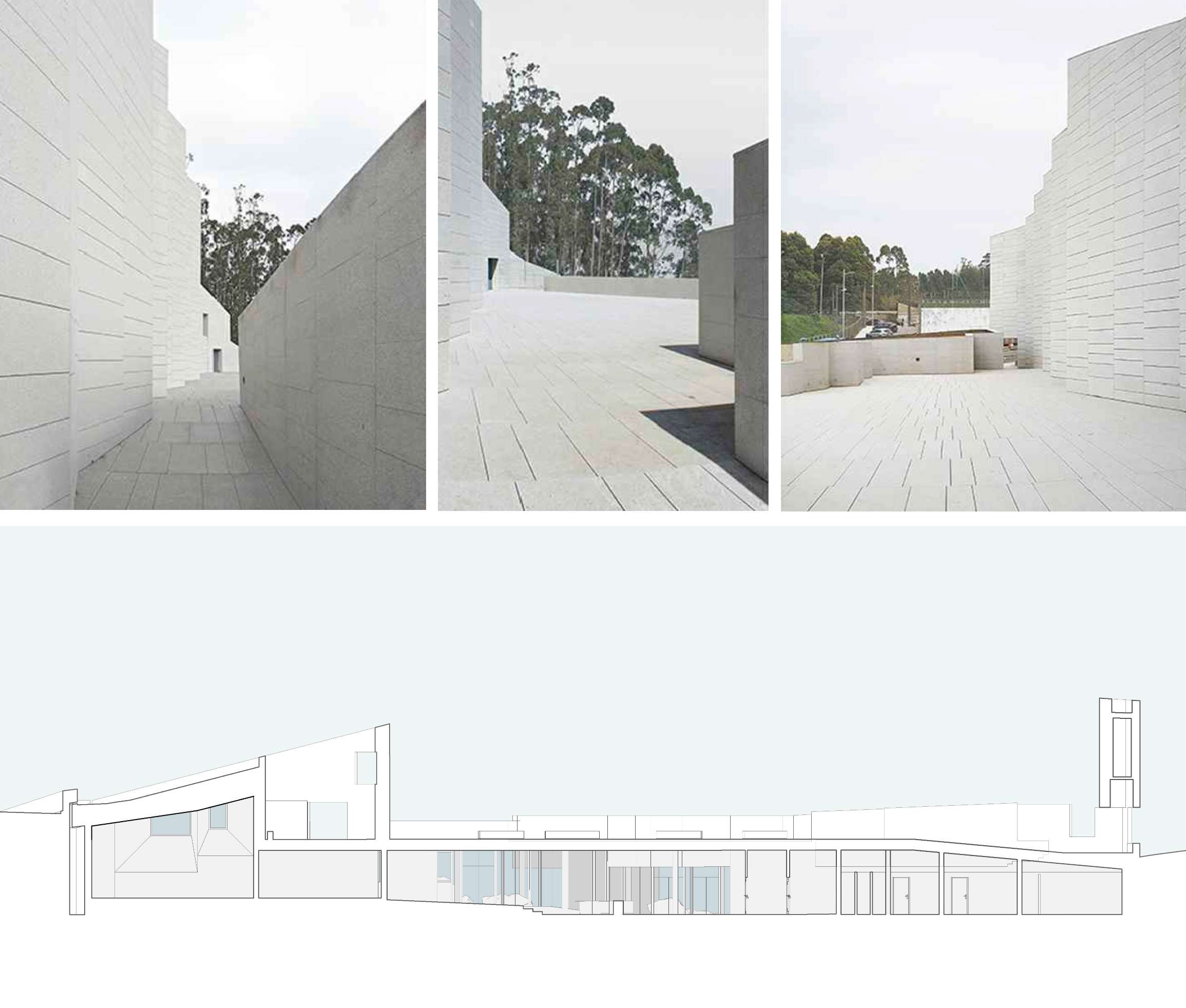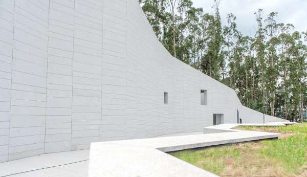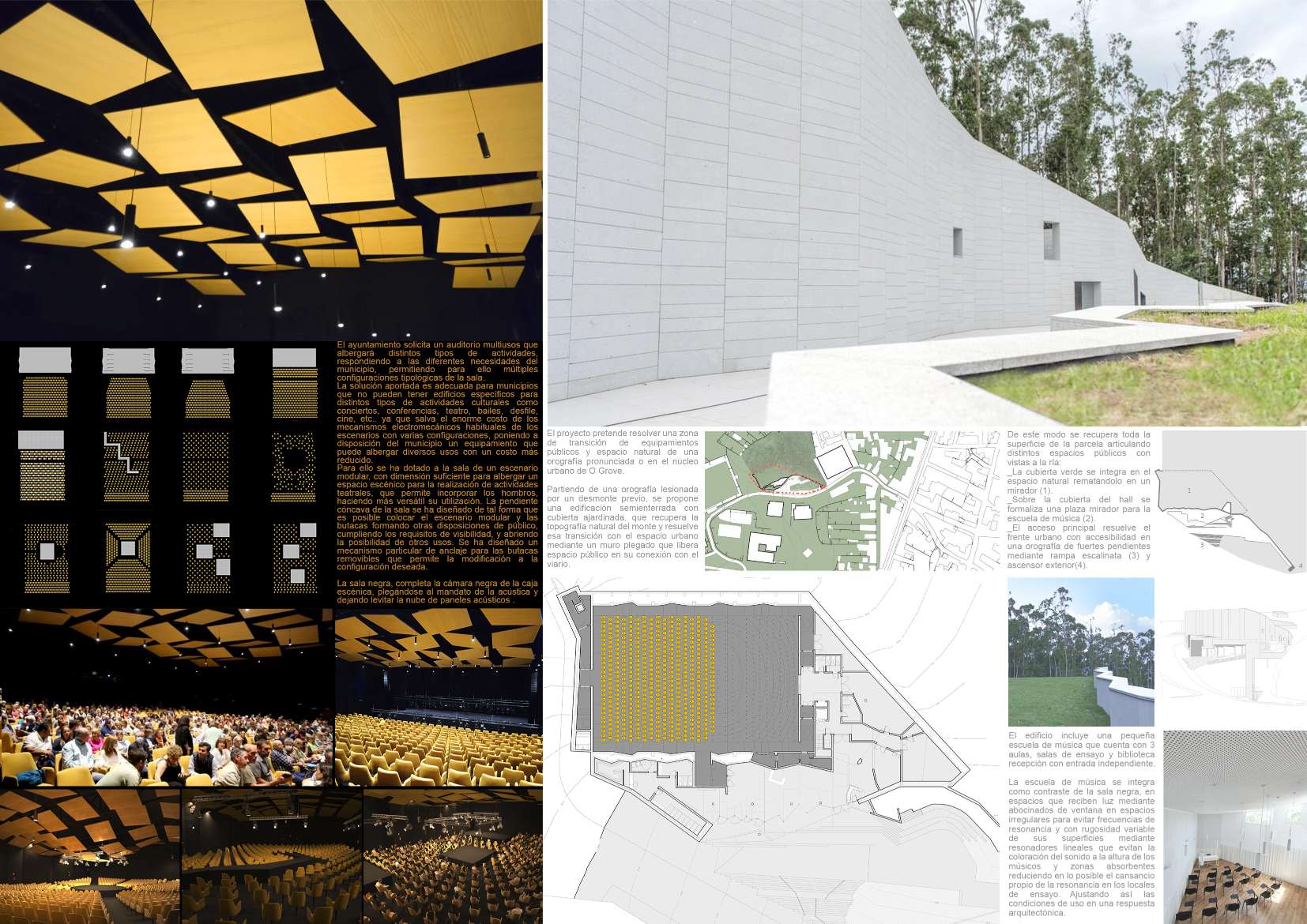 O locus, un monte inserido no centro urbano e parcialmente erosionado para o seu uso como aparcamento provisional, debía albergar agora un equipamento publico de Auditorio e Escola de Música nunha parcela estreita, limite entre o urbano e o espazo natural. Exponse uns muros crebados que suturan ese limite, recuperando a orografía do espazo natural por unha banda e resolvendo, coa edificación e a conformación do espazo publico, a conexión á trama urbana polo outro. Ao ser un municipio de pequena escala solicitábase un espazo flexible multiusos dentro dunha contención económica obrigada. Para iso resólvense as distintas tipoloxías mediante un sistema de butacas extraíbles e tarimas modulares. Este sistema permite, máis aló da flexibilidade, como permutador tipolóxico, un solución en continuidade cos experimentos teatrais dos anos 50 e 60 ata unha obra aberta como proceso operativo contemporáneo de simultaneidade ou indeterminación tipolóxica. A sala negra, completa a cámara negra da caixa escénica, encartándose ao mandato da acústica e deixando levitar a nube de paneis acústicos regulables.