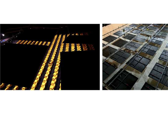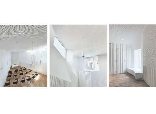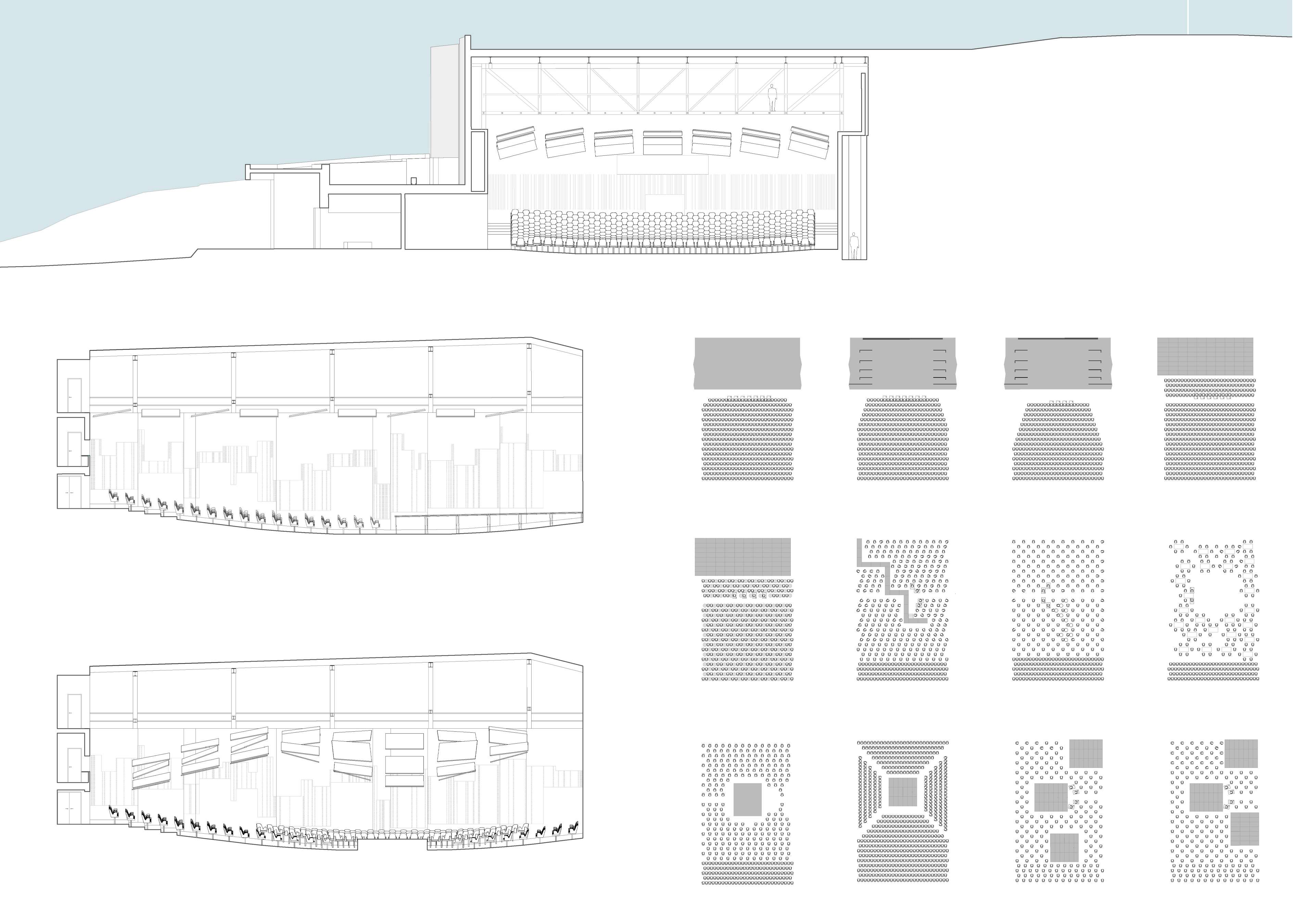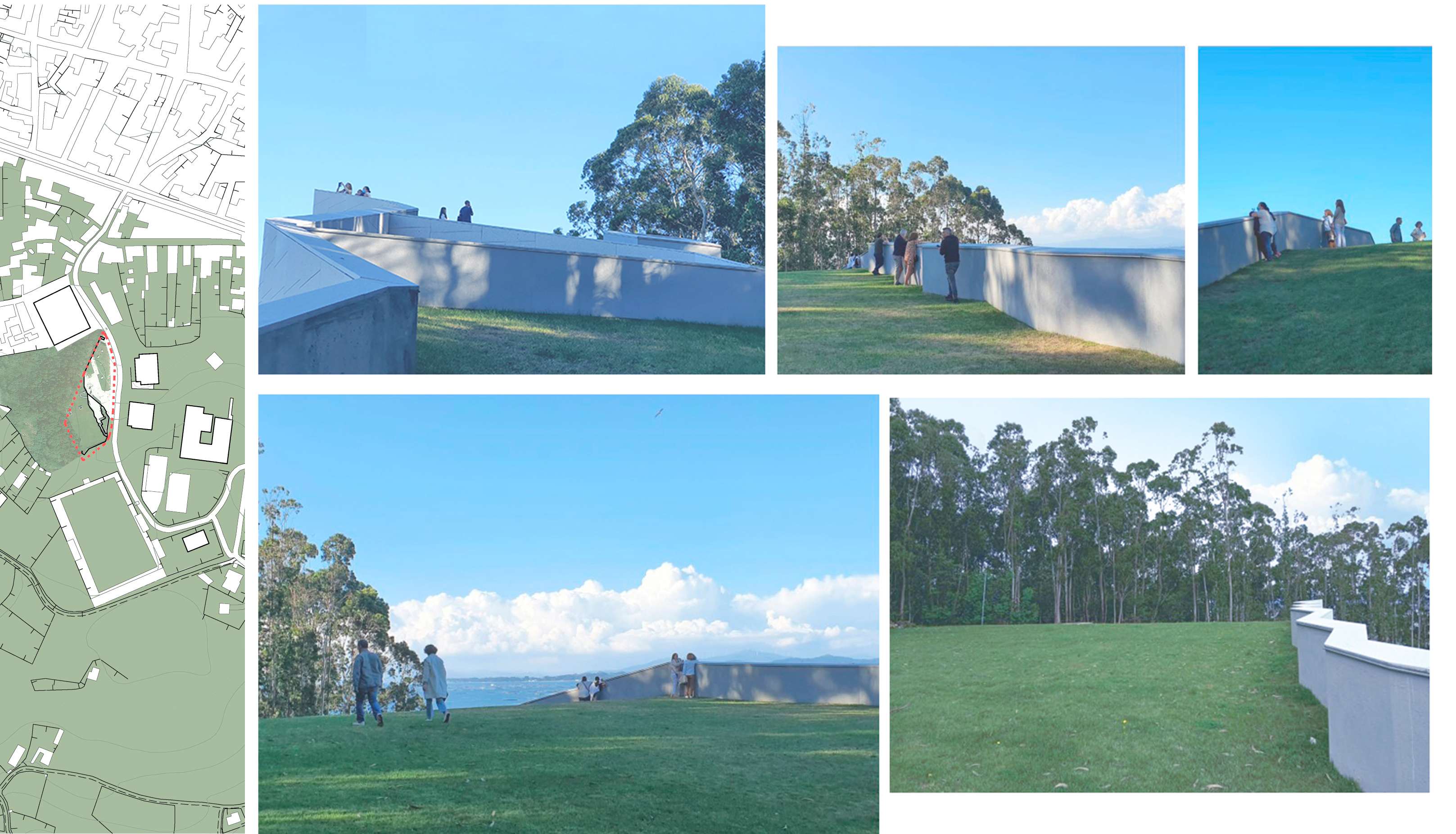 O locus, un monte inserido no centro urbano e parcialmente erosionado para o seu uso como aparcamento provisional, debía albergar agora un equipamento publico de Auditorio e Escola de Música nunha parcela estreita, limite entre o urbano e o espazo natural. Exponse uns muros crebados que suturan ese limite, recuperando a orografía do espazo natural por unha banda e resolvendo, coa edificación e a conformación do espazo publico, a conexión á trama urbana polo outro. Ao ser un municipio de pequena escala solicitábase un espazo flexible multiusos dentro dunha contención económica obrigada. Para iso resólvense as distintas tipoloxías mediante un sistema de butacas extraíbles e tarimas modulares. Este sistema permite, máis aló da flexibilidade, como permutador tipolóxico, un solución en continuidade cos experimentos teatrais dos anos 50 e 60 ata unha obra aberta como proceso operativo contemporáneo de simultaneidade ou indeterminación tipolóxica. A sala negra, completa a cámara negra da caixa escénica, encartándose ao mandato da acústica e deixando levitar a nube de paneis acústicos regulables.