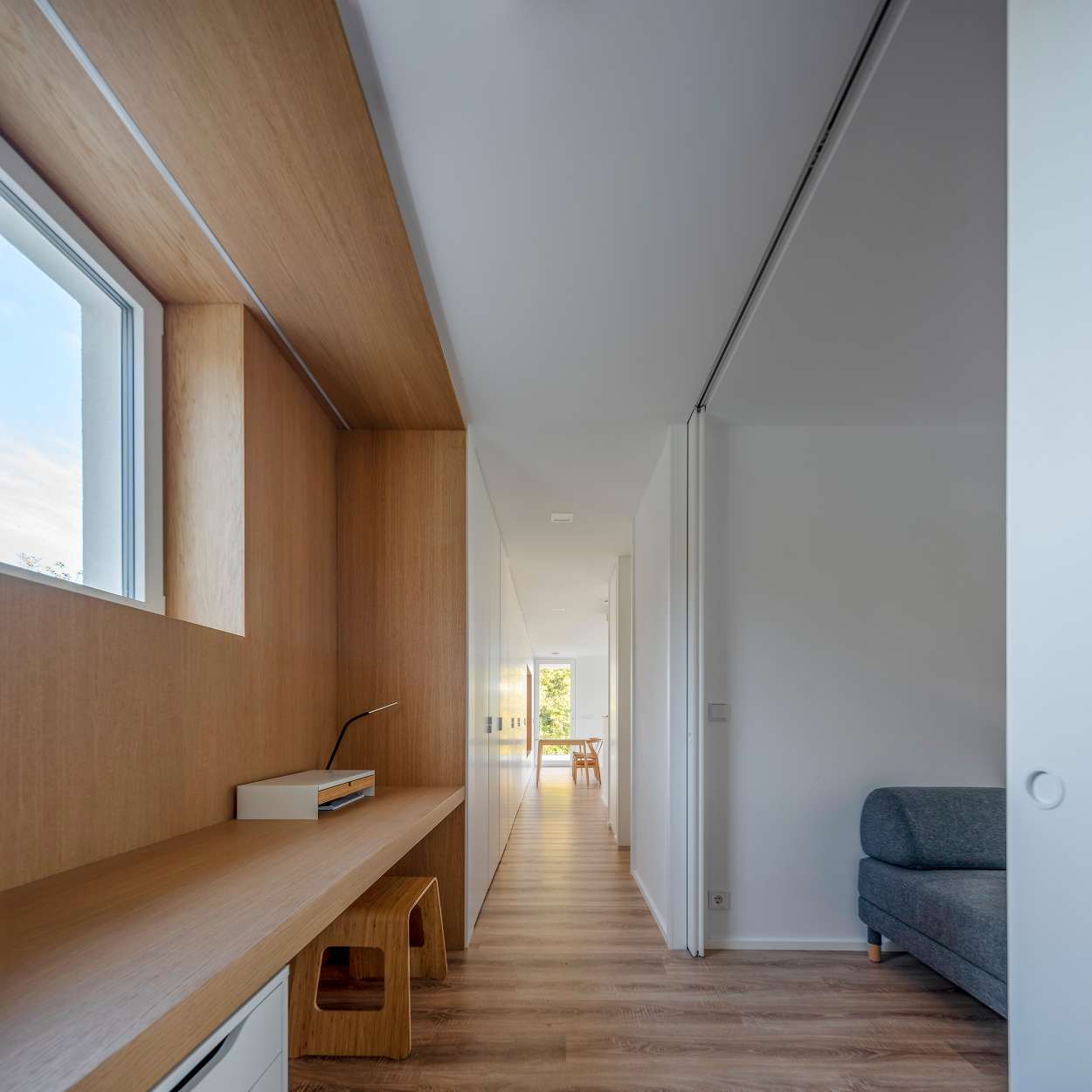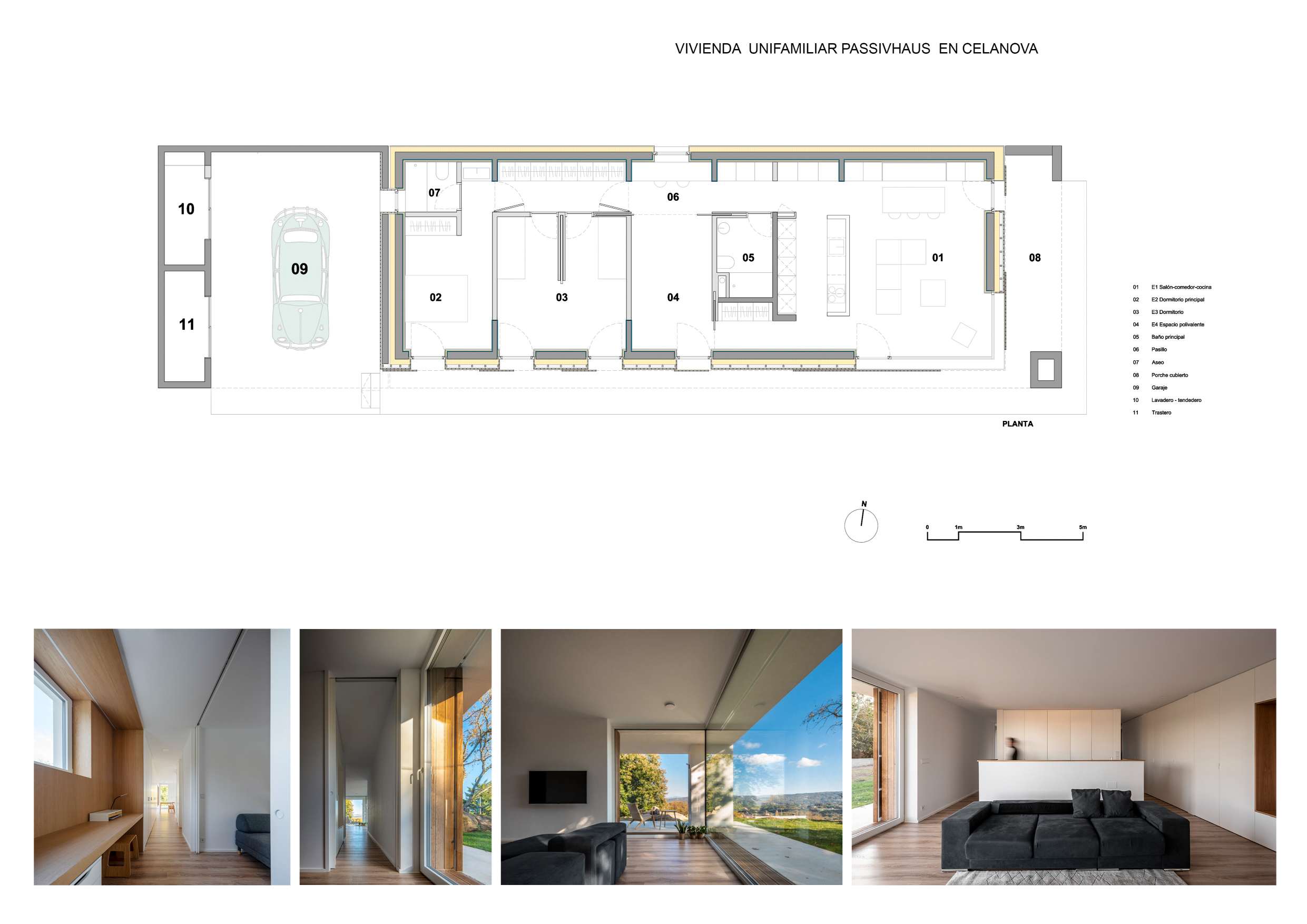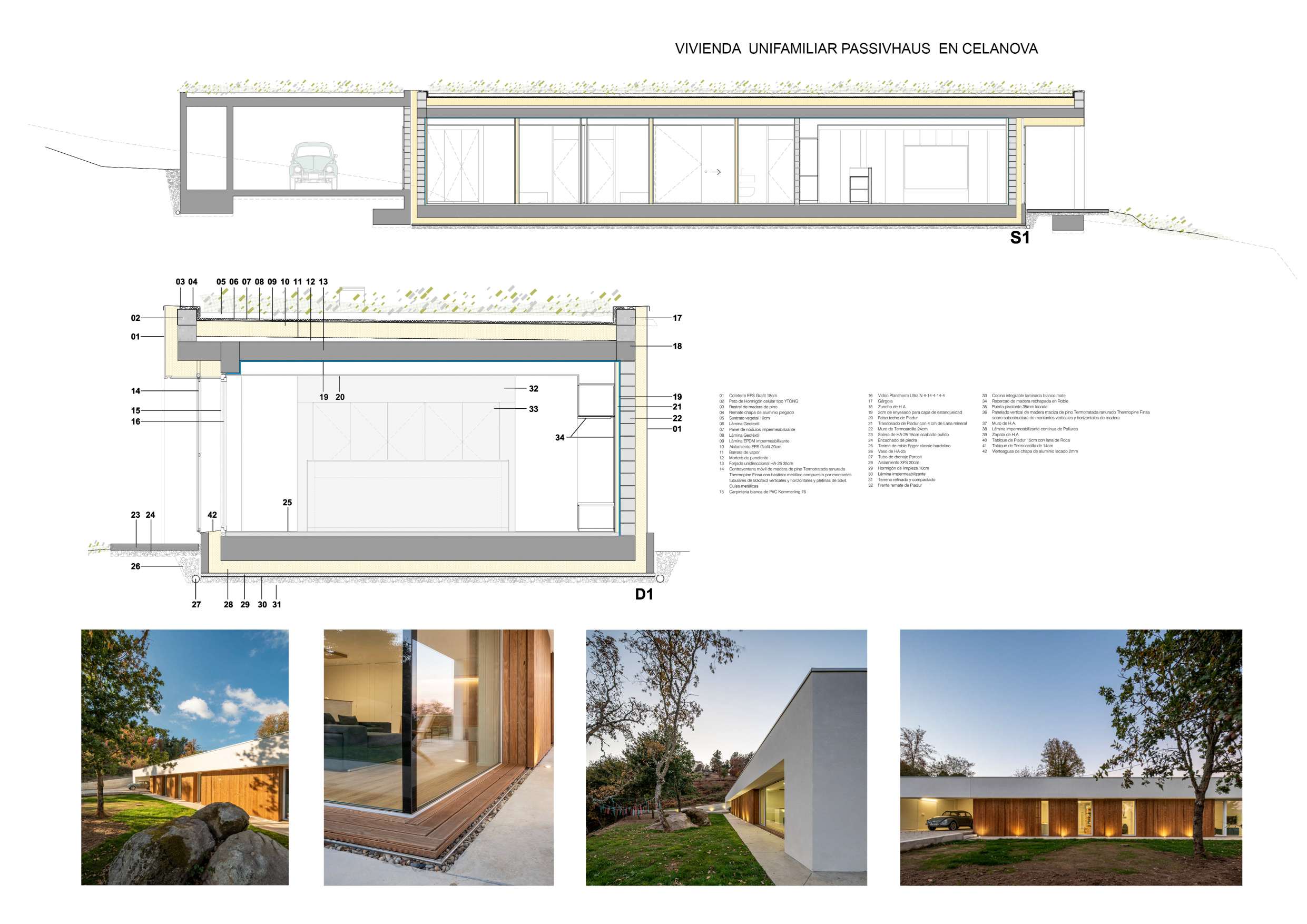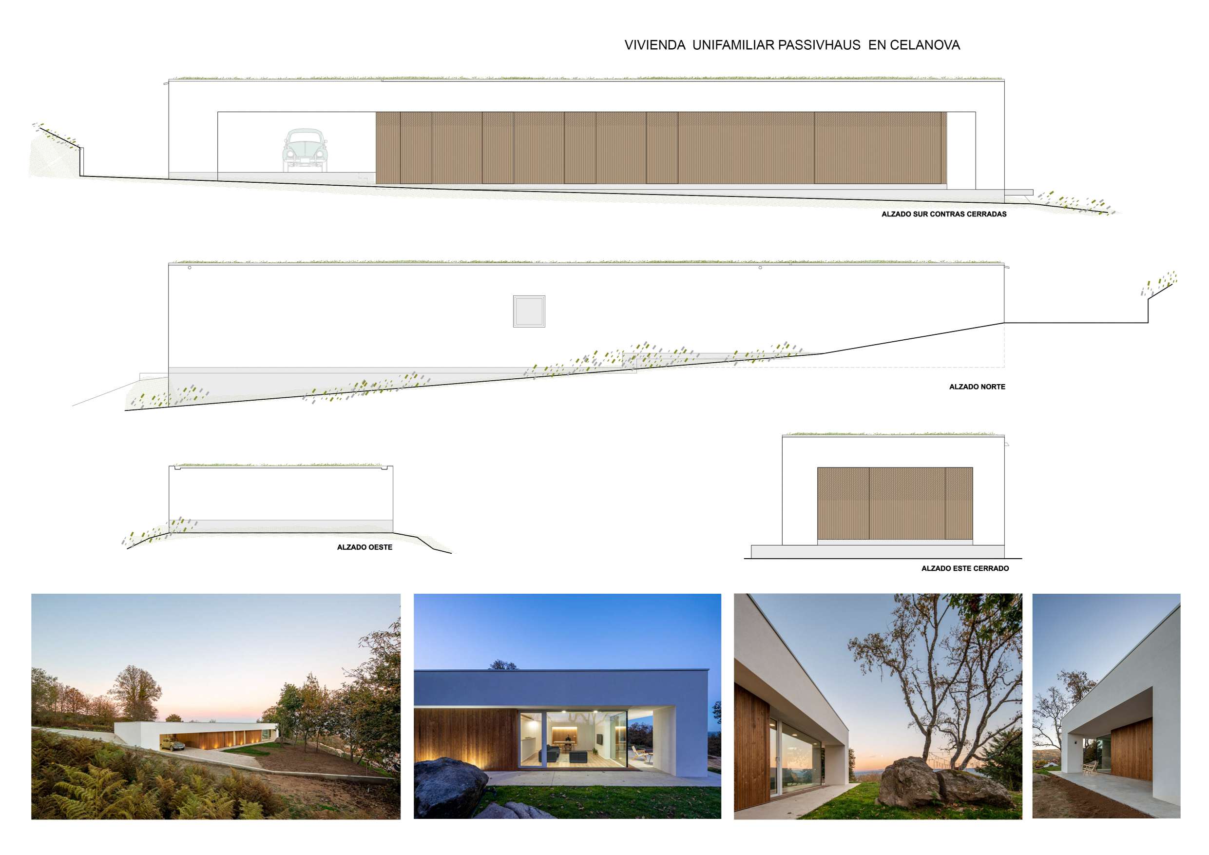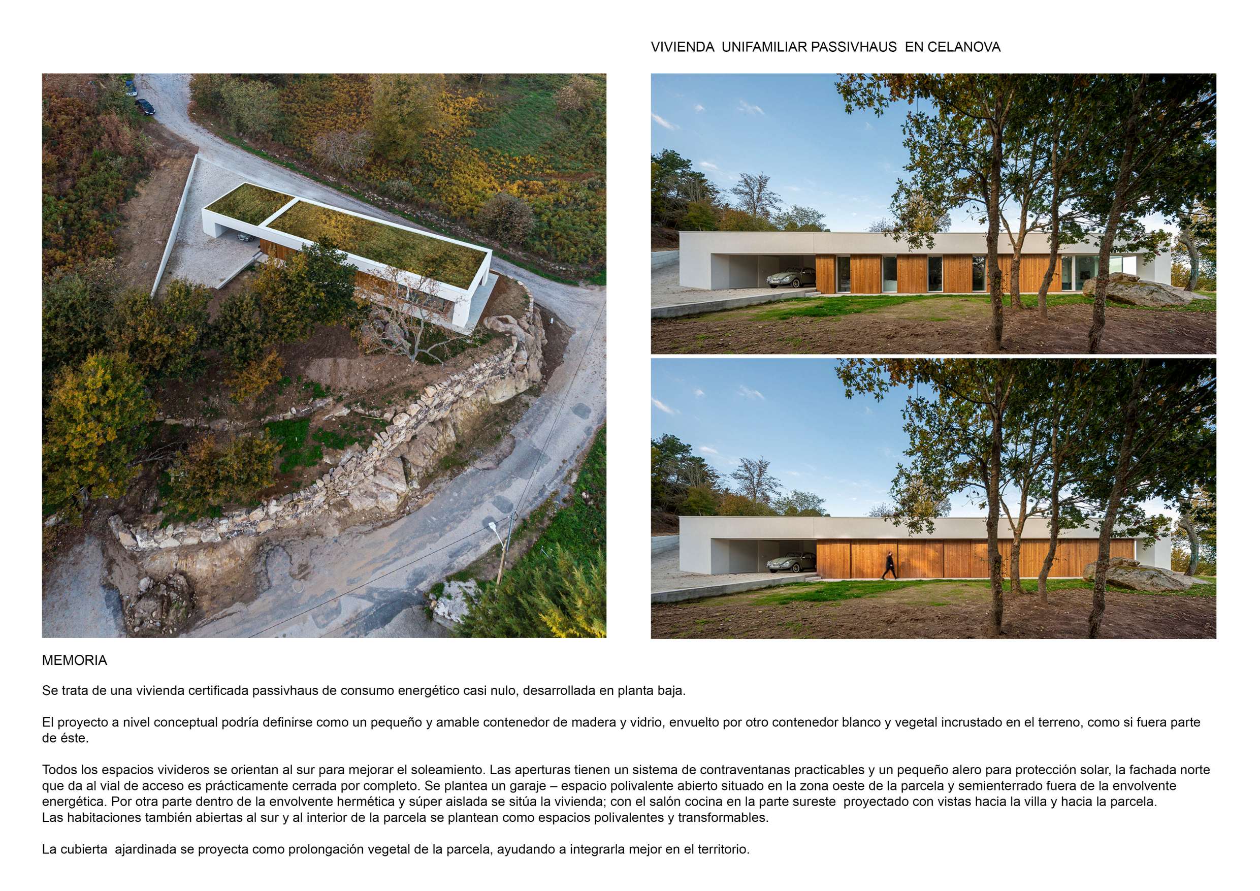Trátase dunha vivenda certificada passivhaus de consumo enerxético case nulo, desenvolta en planta baixa, todos os espazos vivideros oriéntanse ao sur para mellorar o soleamiento, as aperturas teñen un sistema de contraventás practicables e un pequeno beirado para protección solar, a fachada norte que dá ao vial de acceso está practicamente pechada por completo, exponse un garaxe –espazo polivalente aberto situado na zona oeste da parcela, semienterrado e fóra da envolvente enerxética . Por outra banda dentro da envolvente hermética e súper illada sitúase a vivenda; co salón- cociña na párte sur –este proxectado con vistas cara á vila e cara á parcela, as habitacións tamén abertas ao sur e ao interior da parcela plantéanse como espazos polivalentes e transformables. A cuberta desta, axardinada, proxéctase como prolongación vexetal da parcela, axudando a integrala mellor no territorio. O proxecto a nivel conceptual podería definirse como un pequeno e amable contedor de madeira e vidro, envolto por outro contedor branco e vexetal incrustado no terreo, coma se fose parte deste.