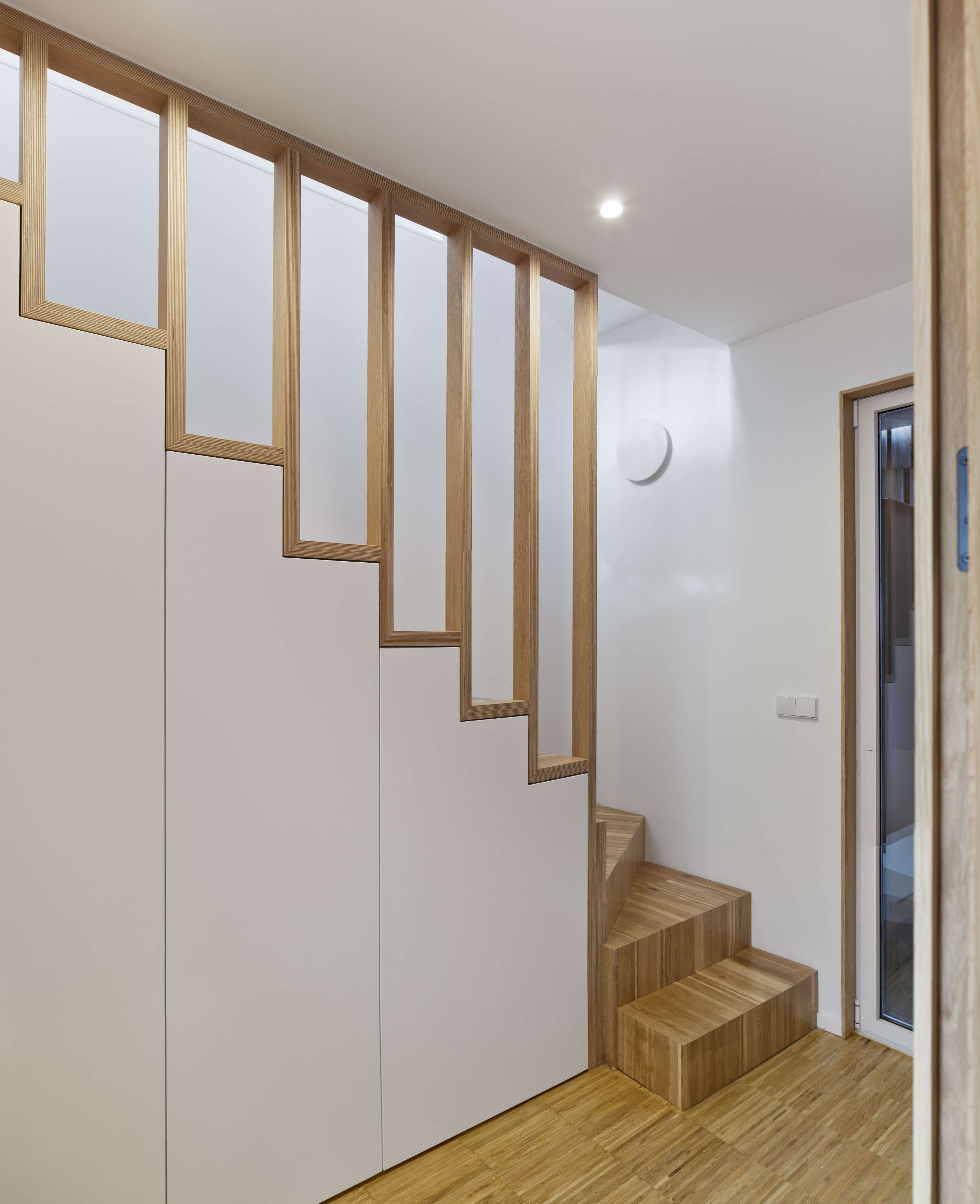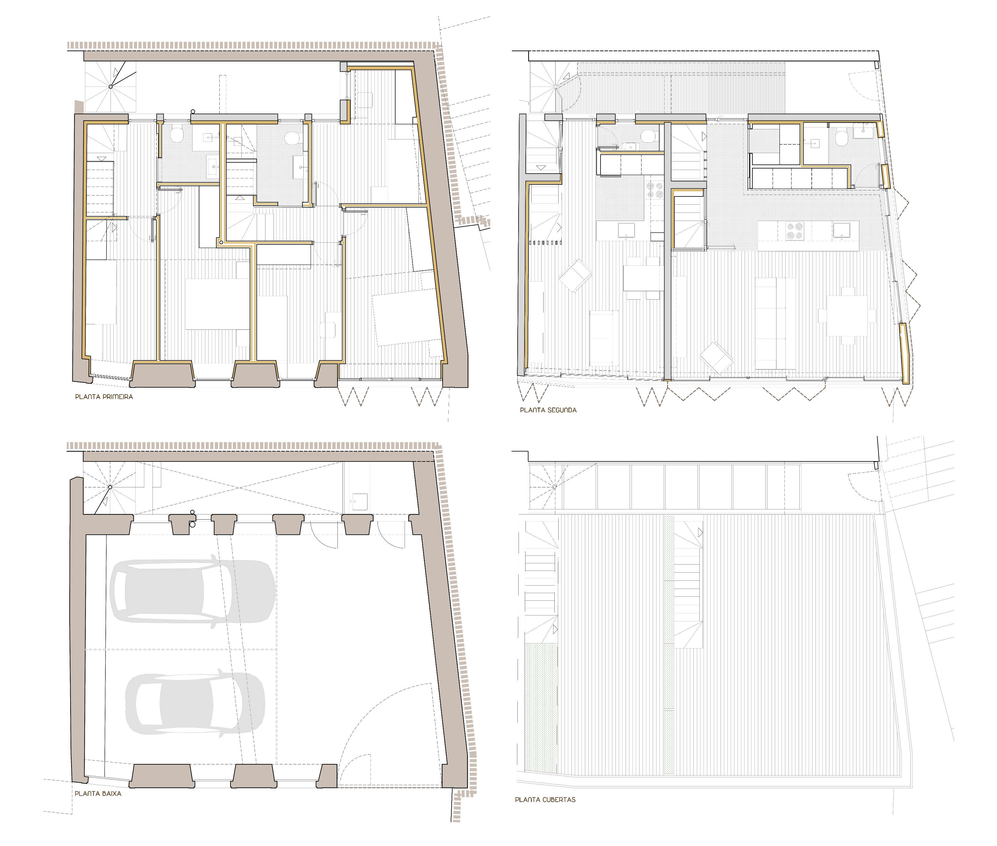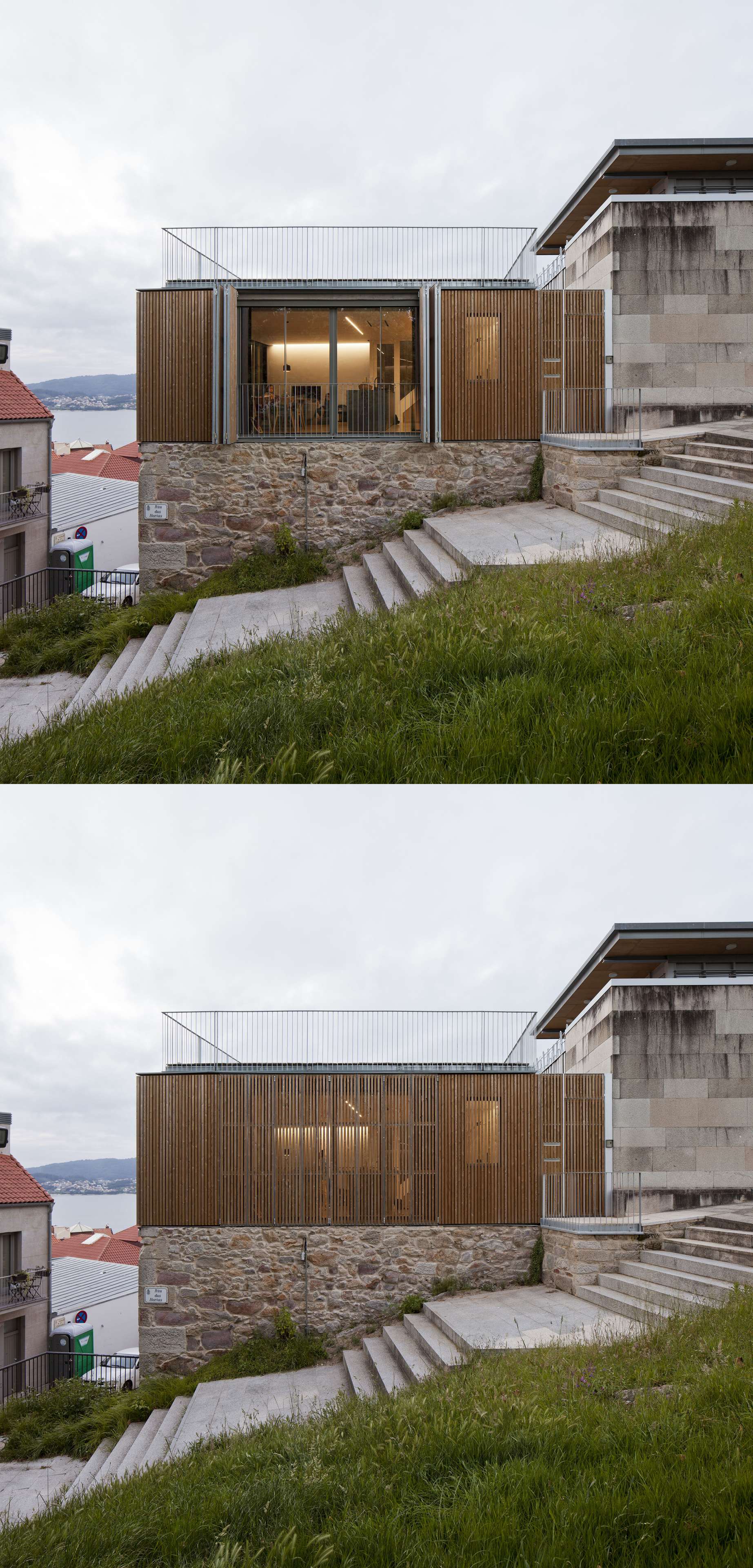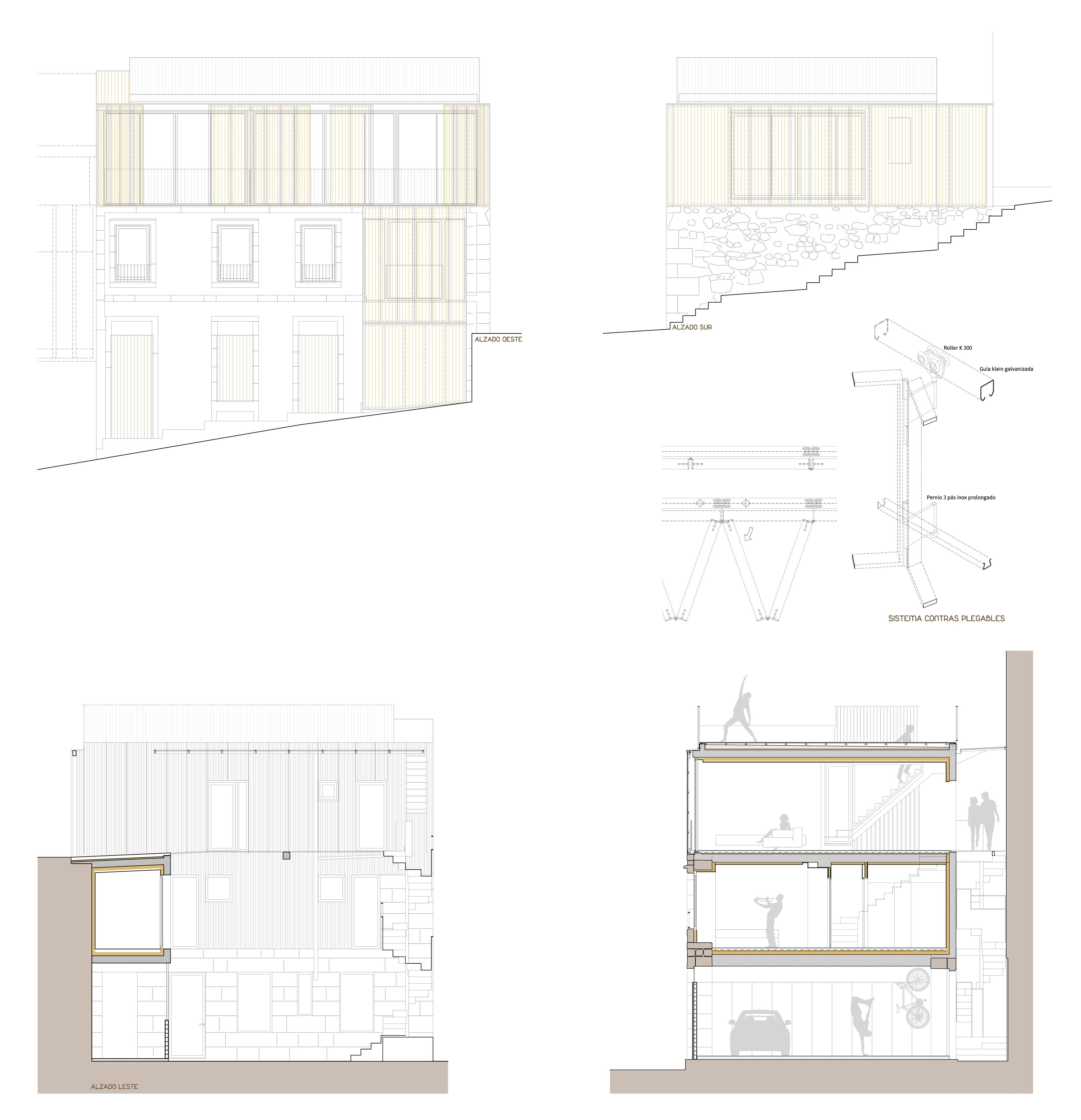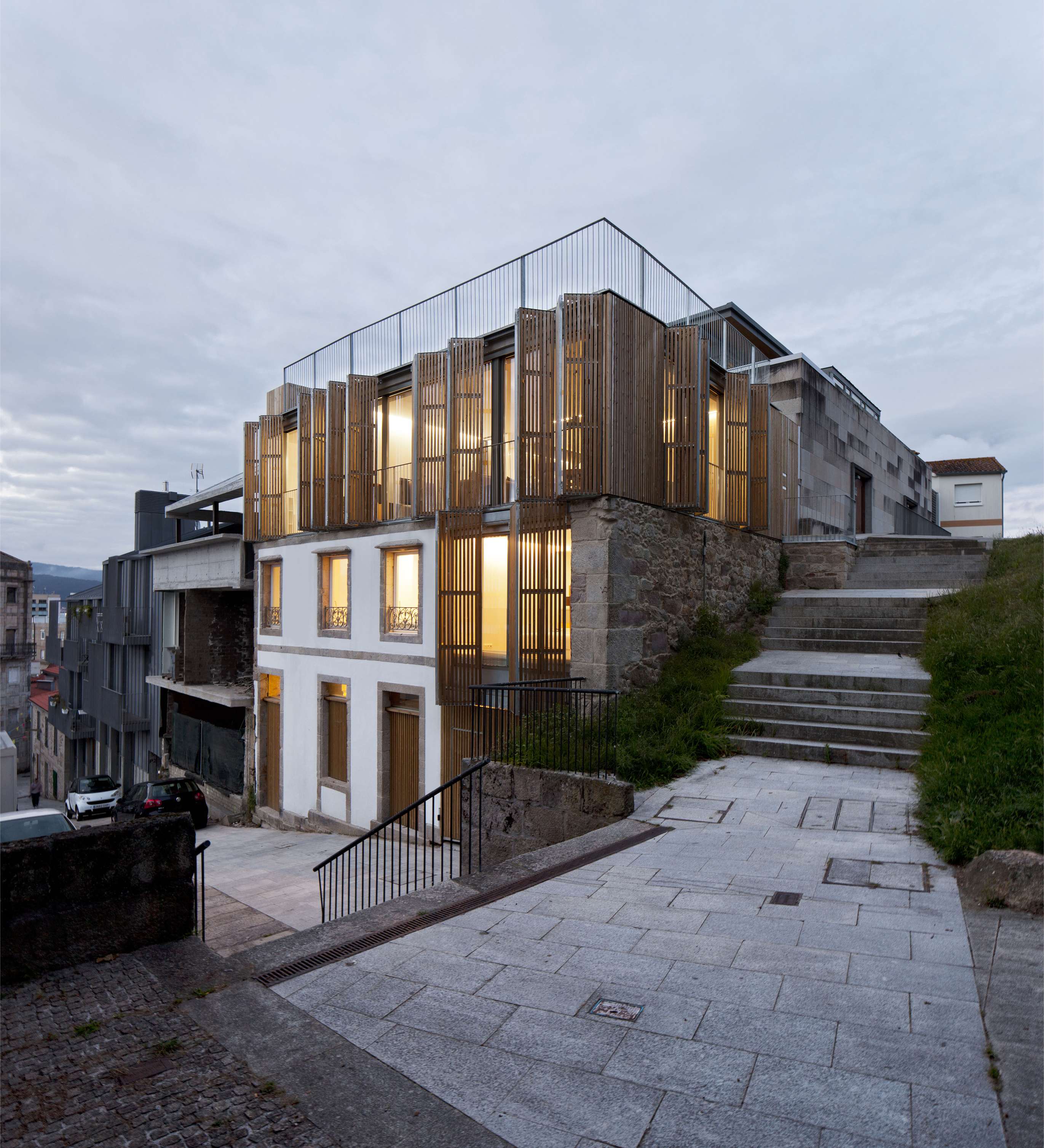 O proxecto, que ocupa unha situación limítrofe entre a escala humana das vivendas do Casco Histórico e o recinto amurallado de defensa da cidade, formaliza o cambio de escala mediante unha incisión practicada na fachada orixinal en continuidade coa ampliación da planta superior. O proxecto estende pola nova fachada un sistema de contraventás encartables, que permiten regular á demanda tanto a privacidade coma a exposición solar da vivenda. A fachada toma vida propia no movemento diario das pezas, facendo explícito un rexurdir da edificación. O emprego da madeira tratada en crudeza, enlaza o pasado e o futuro do Casco Vello sen fisuras, e polo tanto xustifica a colonización do resto da edificación, estendéndose hasta o baixo para acoller o acceso ao garaxe. Optamos polo tanto por unha solución de intervención de xesto firme e sinceridade construtiva palpable: o propio corte preciso para o acceso dos vehículos, imprescindible para favorecer unha RE-HABITACIÓN do Casco Vello non xentrificada, practícase á vista nun xesto unificado co engadido da planta superior. A solución conserva o ritmo tradicional de ocos, e salienta a contención do terreo que ofrece a propia edificación, á vez que formaliza unha nova escala para a edificación que se integra perfectamente no lugar. Funcionalmente, emprégase o patio traseiro coma espazo de comunicación vertical e horizontal. O acceso principal ás vivendas se produce dende o xardín da muralla na rúa Hortas. Baixo un teito acristalado se instala unha pasarela de madeira que da acceso individual ás dúas vivendas e, ao fondo, á escaleira de caracol que comunica co garaxe dous niveis por debaixo. Ambas vivendas aproveitan as vistas e maior iluminación da planta ampliada para situar á area de día. A luz accede filtrada ao interior a través das lamas de madeira, empregando coma equilibrio lumínico as escaleiras de saída ás terrazas. Os sistema de contraventás alcanza perfectamente o seu obxectivo: regulación de temperatura e privacidade. Un interior no que ver sen ser visto, gozando dun xardín privilexiado con vistas no centro da cidade. As vivendas encáixanse nun quebracabezas dimensional cun condicionante estrutural: a non aparición de piares centrais para dispoñer dunha manobra óptima para os coches. Para isto deseñouse unha viga-muro separando ambas vivendas na planta segunda e servindo de soporte aos forxados superiores. Ambas escaleiras se aproveitan en toda a súa altura para acoller espazos de almacenamento e servizo das vivendas. Os dormitorios se sitúan prioritariamente con fiestras á fachada principal. Empréganse acabados en madeira de carballo e revestimentos continuos de cal e arxilas naturais, contrastando con exteriores en pedra, formigón e aceiro galvanizado, co contrapunto das carpintarías e contraventás de madeira.