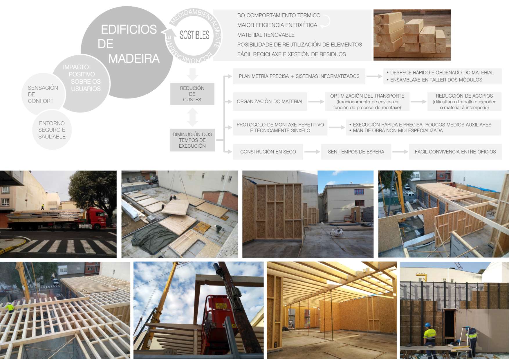 A redución de custes que implica a construción dun edificio con sistemas de madeira ven dada, en parte, pola diminución dos tempos de execución: