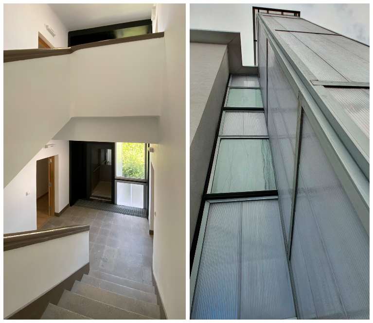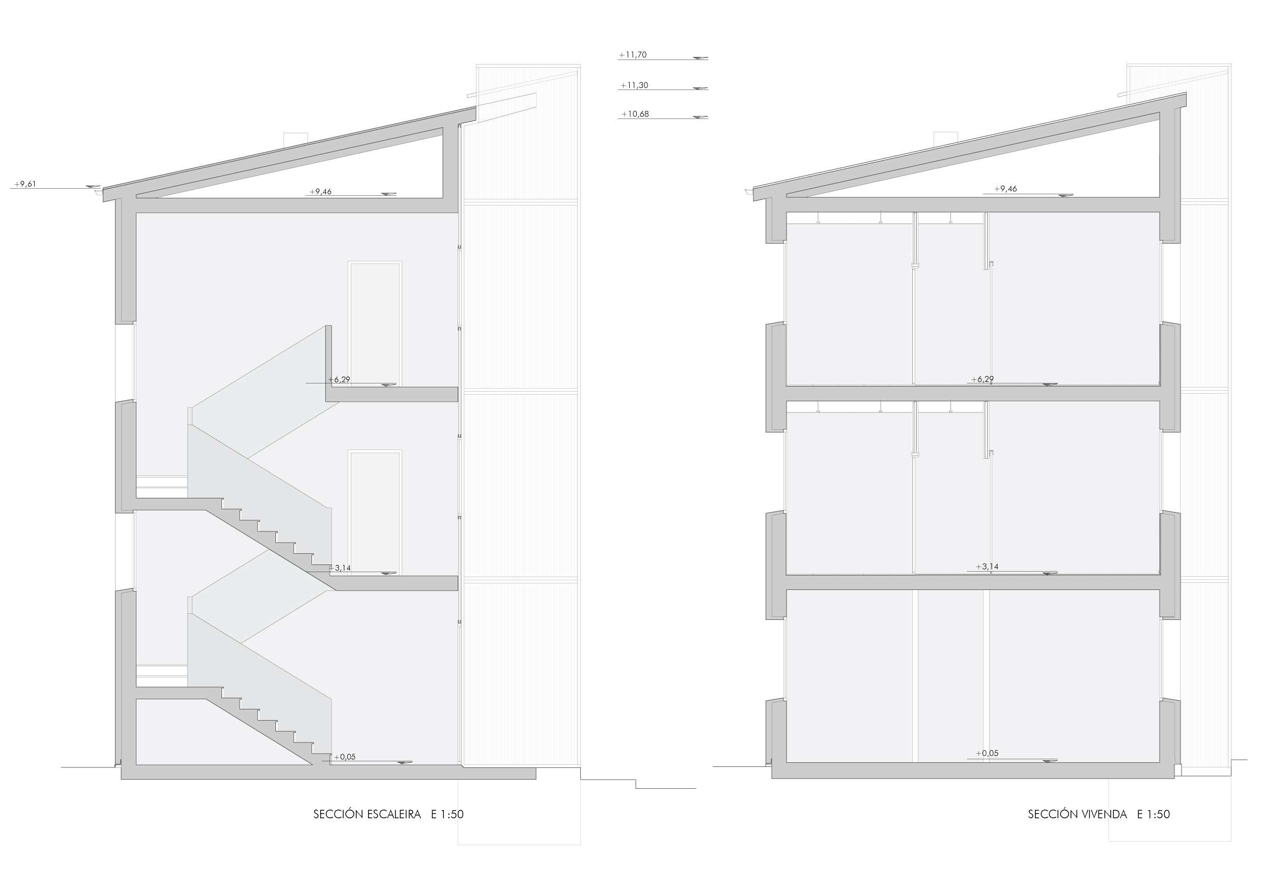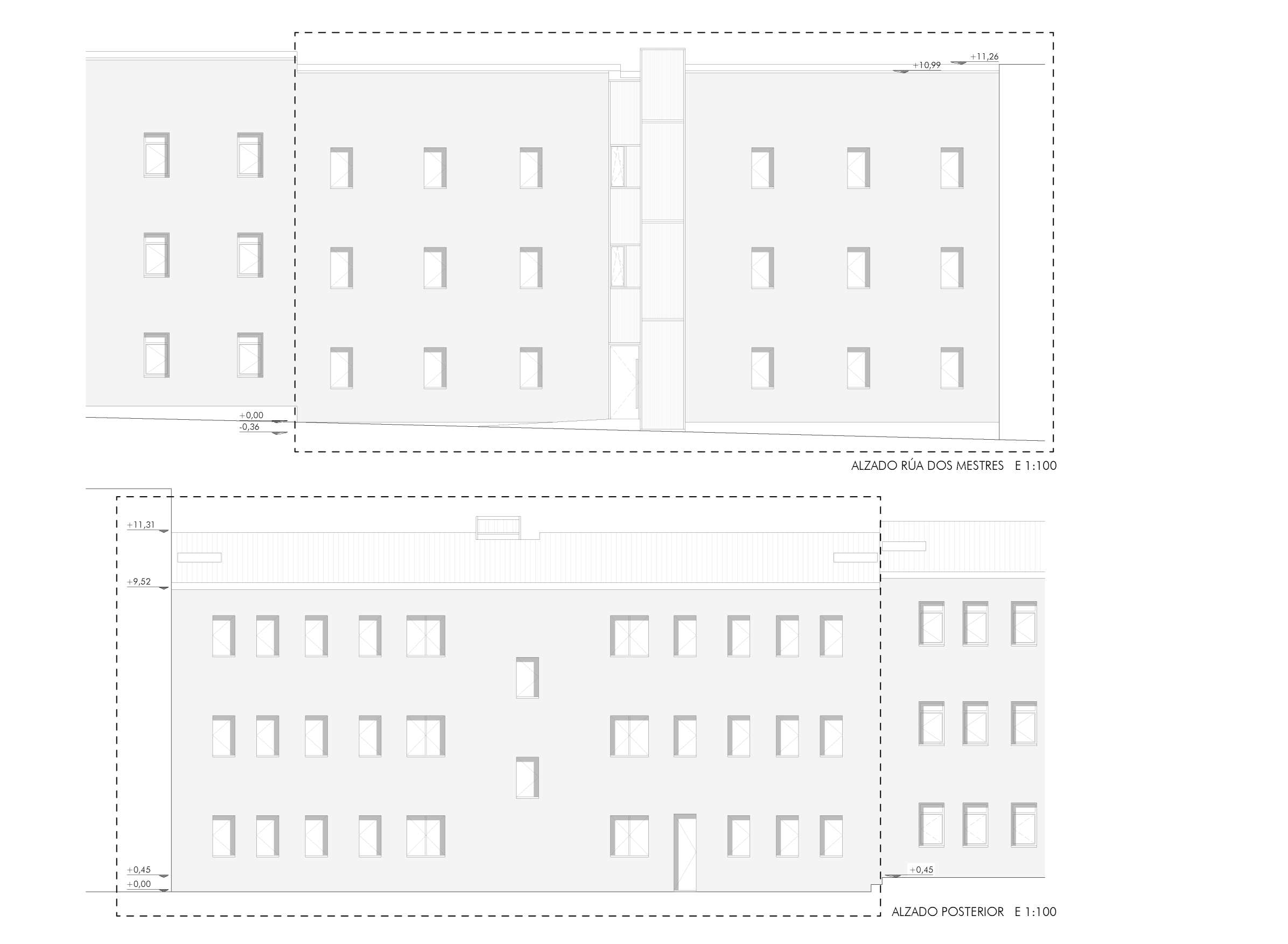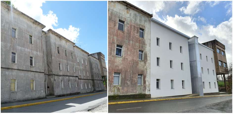 A accesibilidade resólvese cun ascensor na fachada principal, co obxectivo de non alterar a estrutura das escaleiras. Este situarase a carón do portal de acceso, sen prexudicar en ningún caso á iluminación natural das vivendas, e facilitando o acceso ás mesmas. Unha estrutura metálica envolta nunha pel translúcida de policarbonato materializará esta nova peza. No caso da fachada, gravemente afectada polo paso do tempo, dispúxose dun sistema SATE cun acabado de cor branco. A relación da fachada coas carpinterías das vivendas esperta interese no detalle construtivo. Co fin de ter a maior iluminación natural posible, adóptase por axustar á carpintería rasada co límite do SATE. Esta decisión xera unha imaxe moi particular vista dende a rúa.