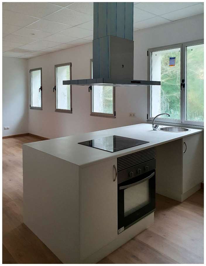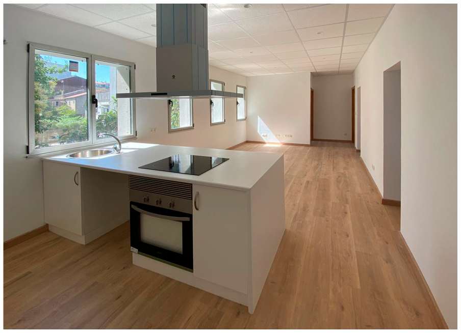 No interior, realízanse axustes na disposición do baño e da cociña, co obxectivo de xerar un gran espazo diáfano orientado ó novo parque urbano proxectado na parte posterior da parcela, a modo de salón-cociña-comedor. Completaremos este novo espazo cunha illa central a modo de cociña. Nas habitacións, manteremos as aperturas orixinais usando portas corredeiras, na procura de non perder a súa imaxe previa. En canto aos acabados interiores, utilizouse un pavimento laminado de madeira na totalidade da vivenda a excepción dos baños, nos que optouse por una solución cerámica. En canto as paredes, decidiuse por unha pintura plástica de textura lisa de cor branco e rodapé.