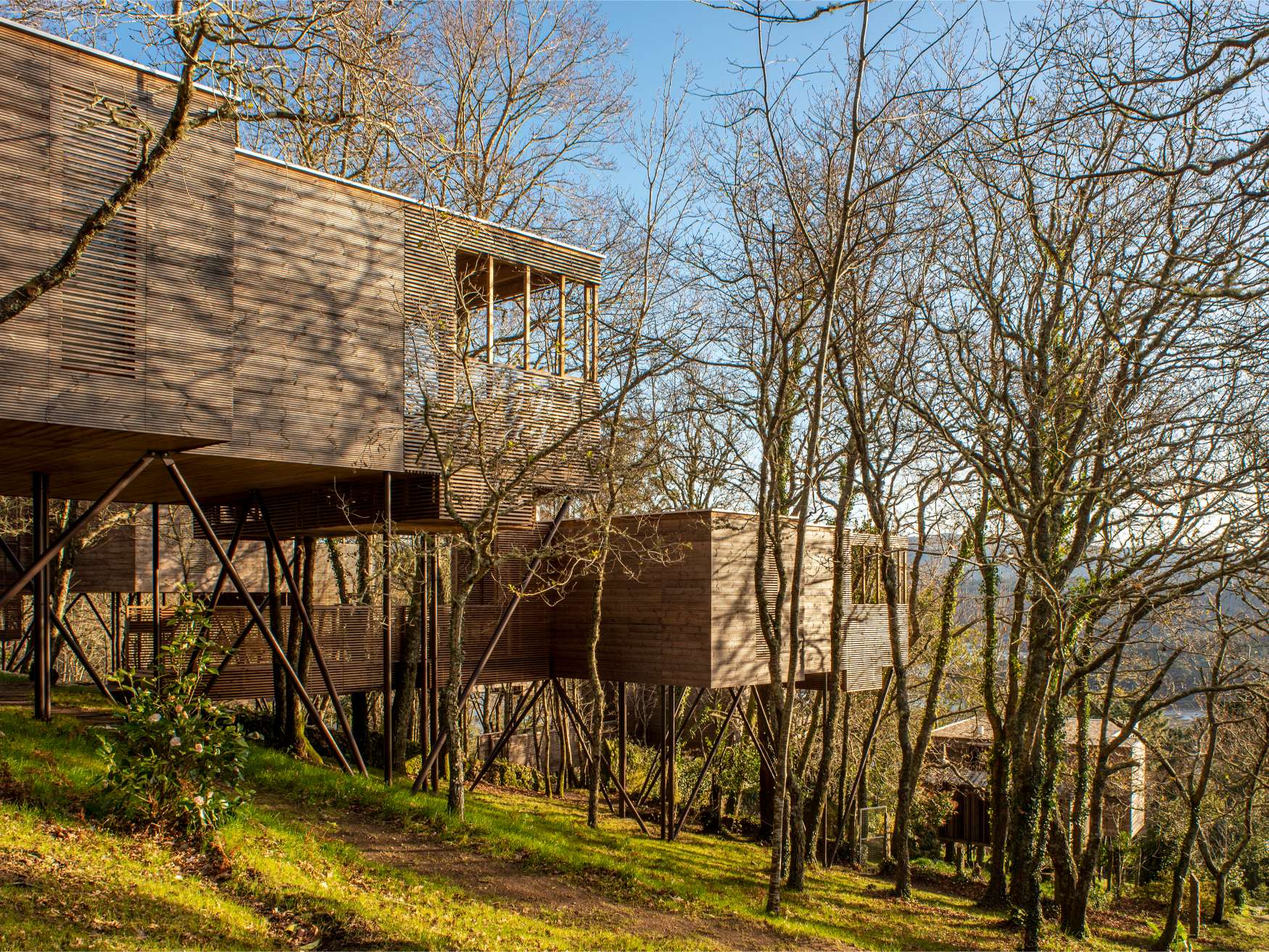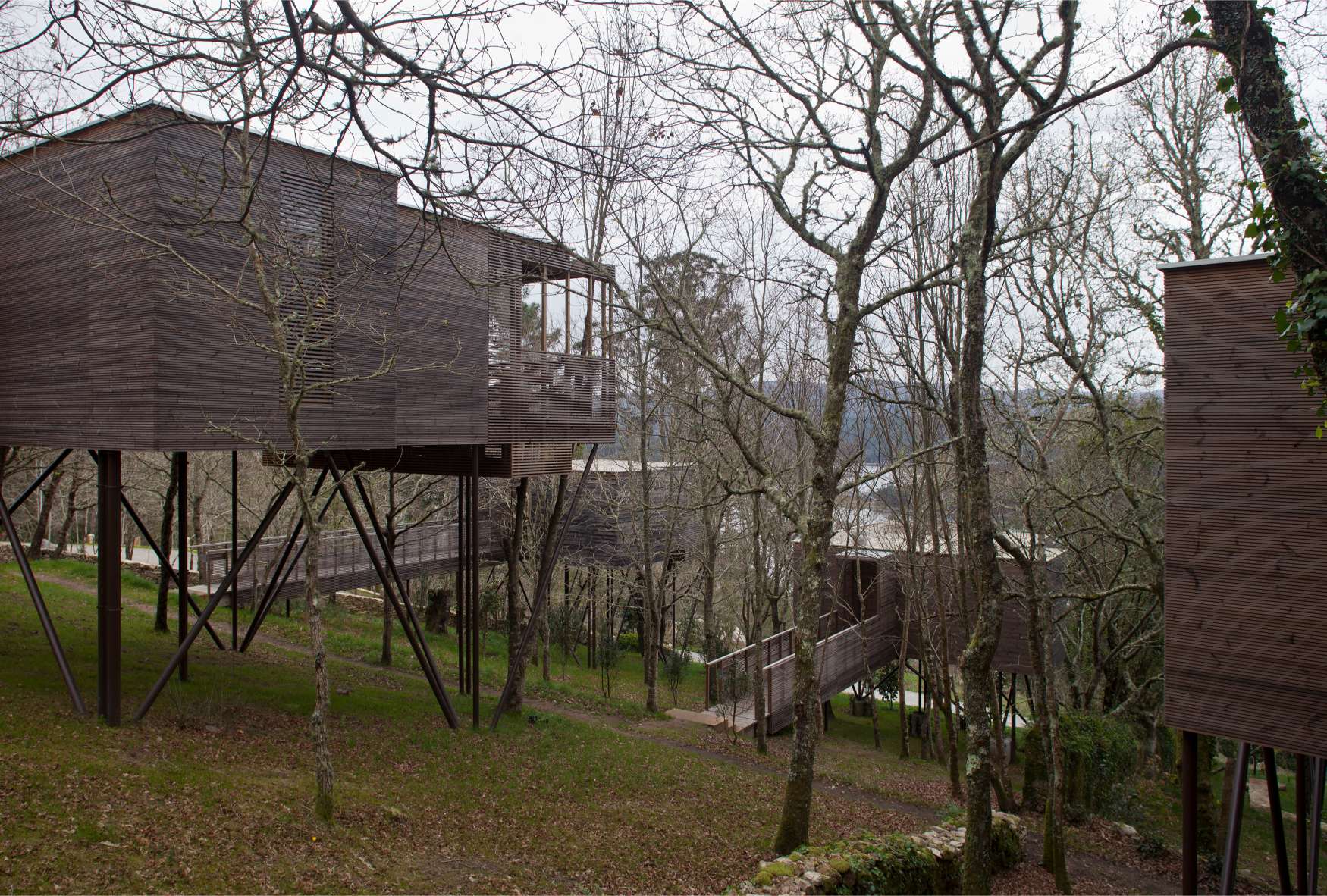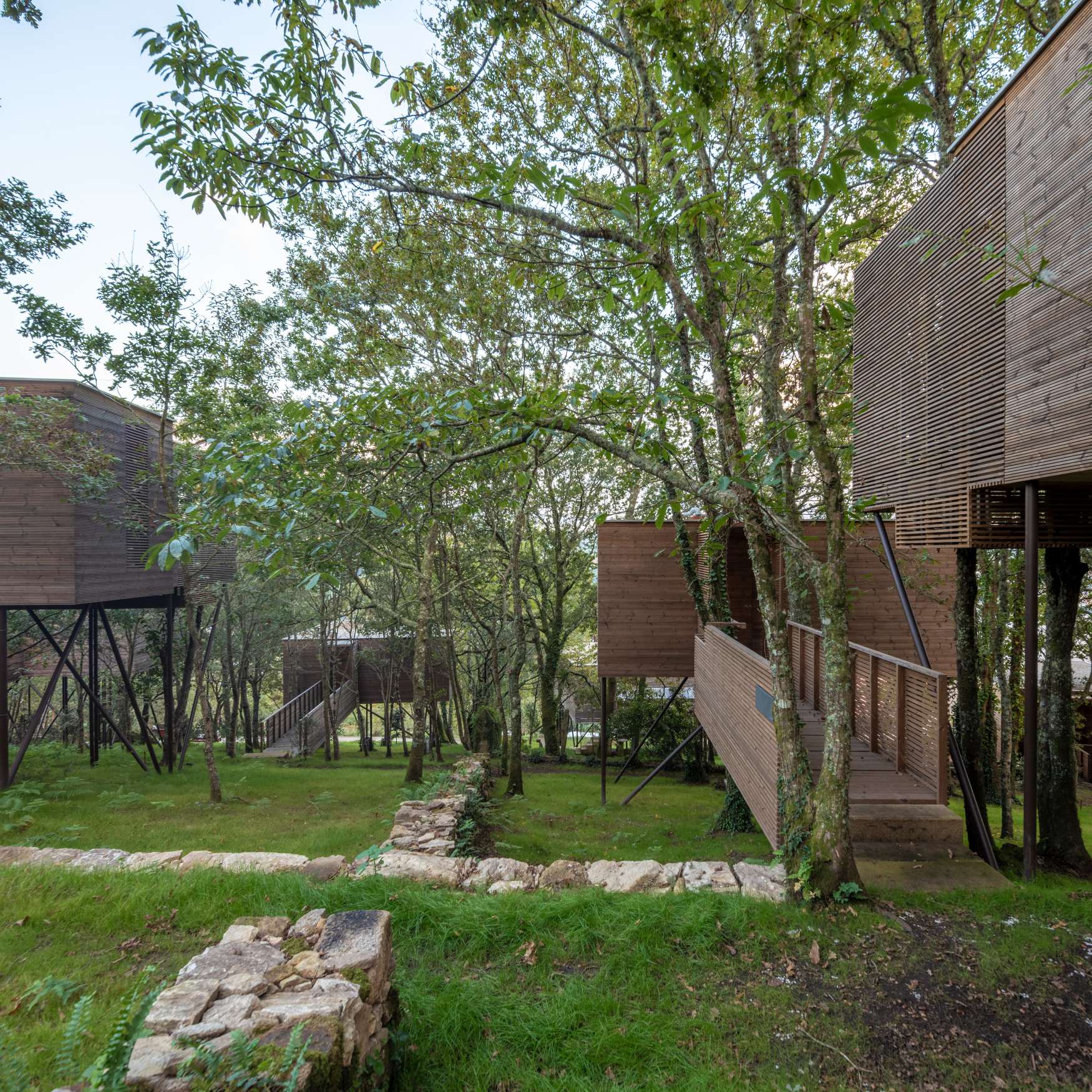 Nun terceiro nivel, defínense os apoios sobre os que soportar as lixeiras estruturas de madeira sen danar as raíces das árbores entre as que se integran. Defínense tamén as alturas das diferentes edificacións e os accesos, buscando integrar as diferentes construcións existentes borrando a liña entre edificacións, preexistencias, natural e artificial.