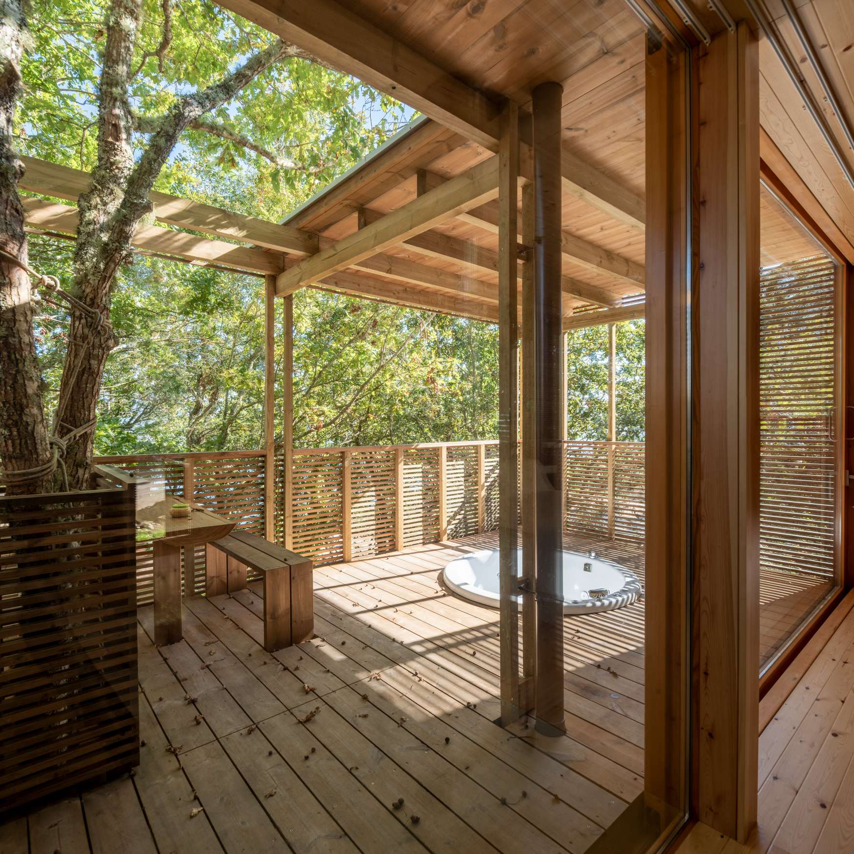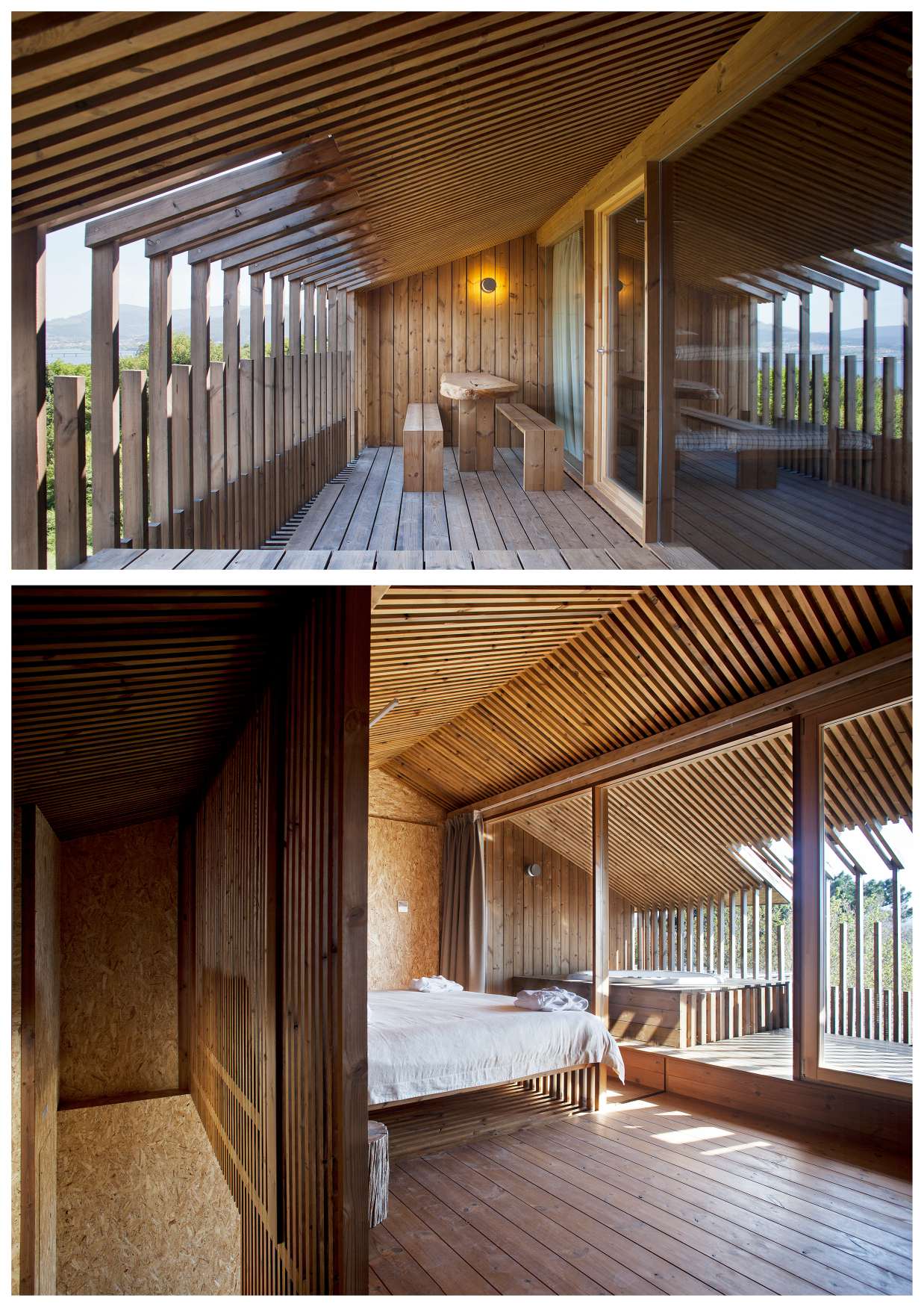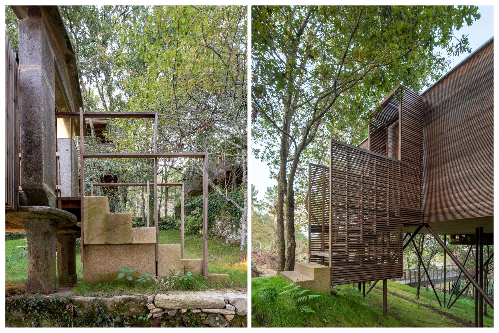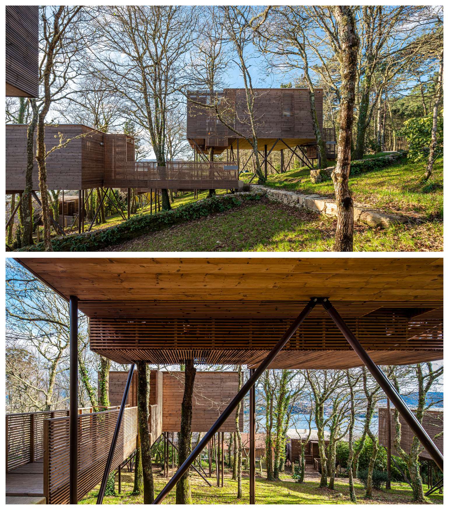 Nun terceiro nivel, defínense os apoios sobre os que soportar as lixeiras estruturas de madeira sen danar as raíces das árbores entre as que se integran. Defínense tamén as alturas das diferentes edificacións e os accesos, buscando integrar as diferentes construcións existentes borrando a liña entre edificacións, preexistencias, natural e artificial.