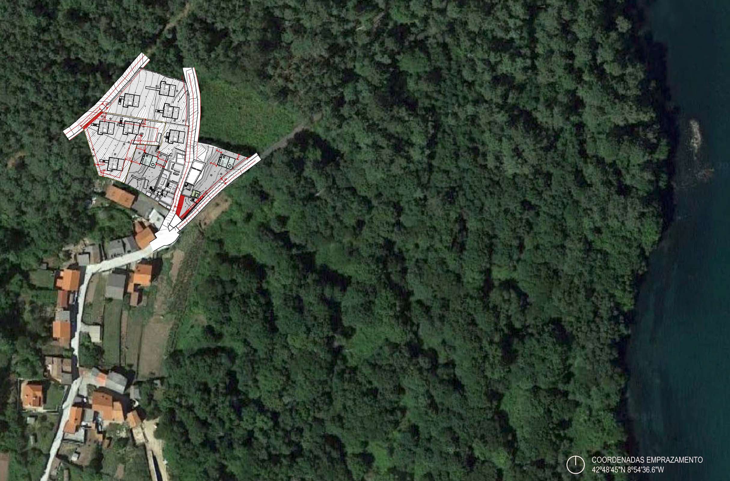 A nivel global, realizase unha primeira aproximación á parcela dende a súa sección, conseguindo unhas primeiras manchas, buscando a intimidade de cada edificación sen renunciar a una sorprendente perspectiva, entre as ramas das árbores, da desembocadura do Río Tambre, os montes do Barbanza, a vila de Noia e, en resumo, o nacemento da ría Muros‐Noia.