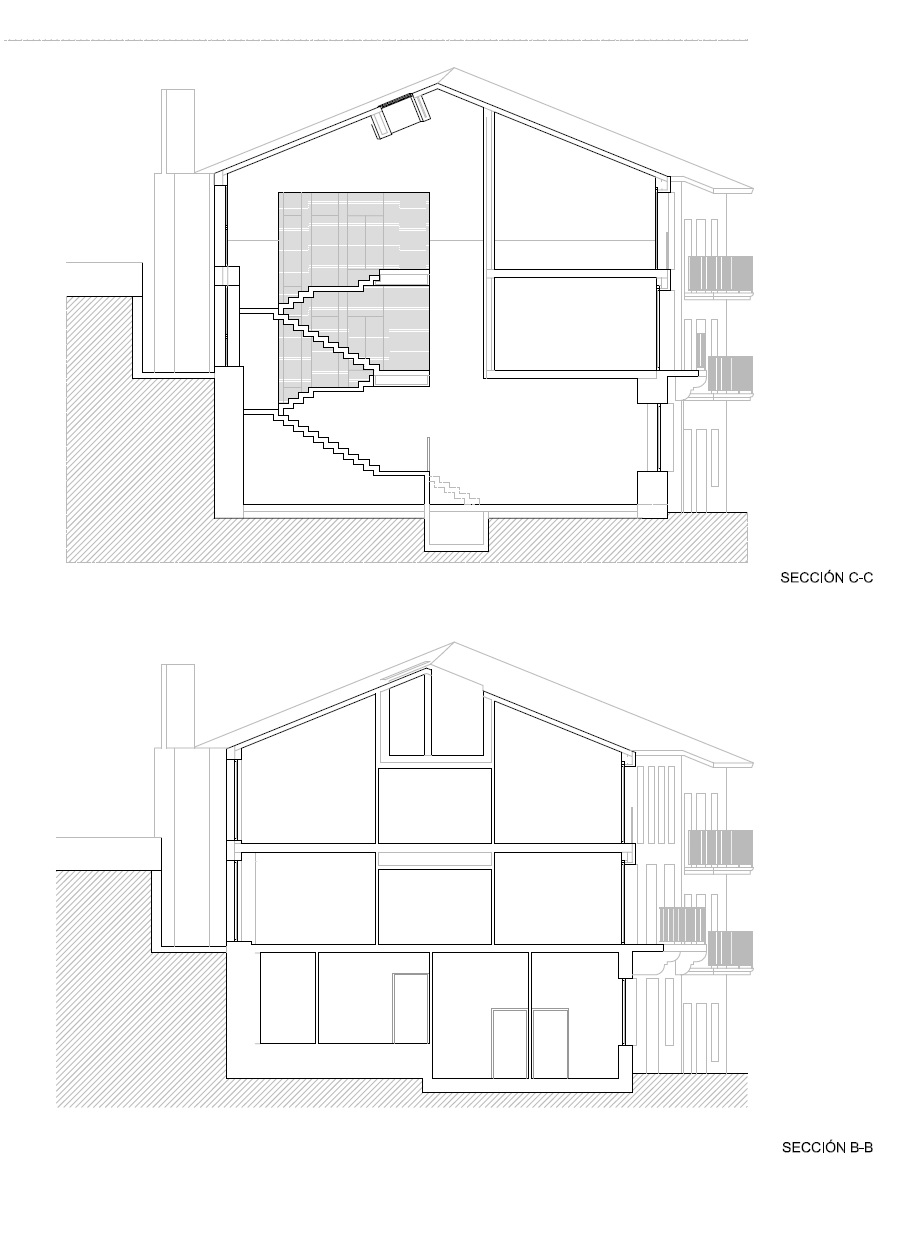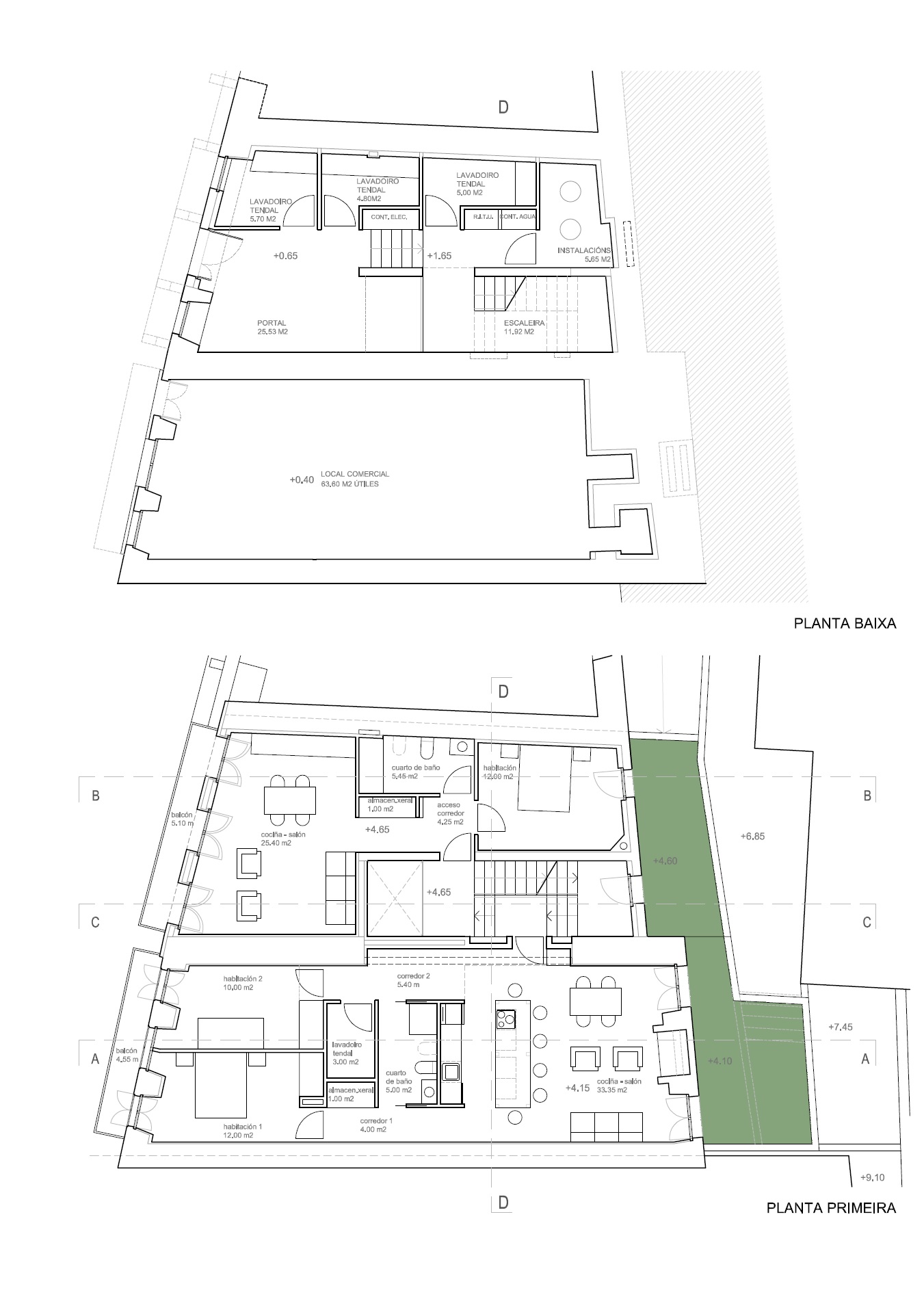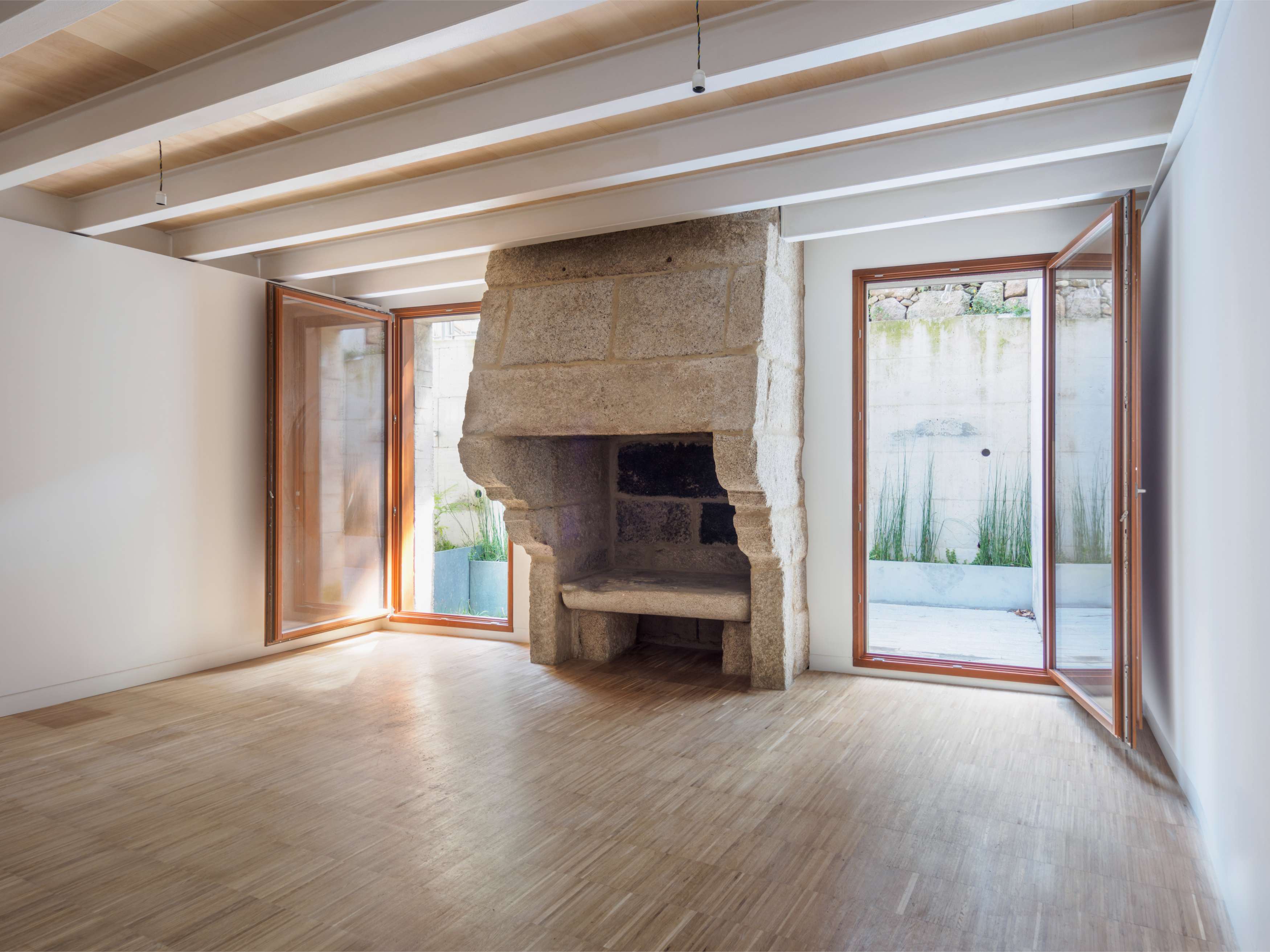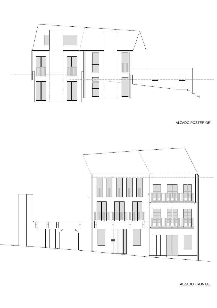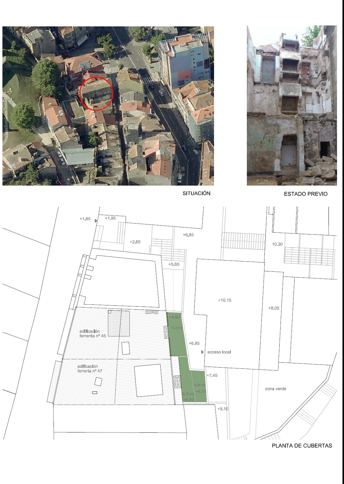 Dúas edificacións a restaurar, Ferrería 45 e 47, na parte alta do casco vello de Vigo, sobre a ladeira que, con gran pendente, encara o castelo de San Sebastián. Enclave que enterrou a planta baixa e primeira no fondo da parcela. Este é o punto de partida do proxecto, o principal problema a resolver. Decídeseescavar un patio inglés nese fondo para dar fachada ás vivendas: ventilación, luz e un espazo axardinado privado. Consérvase en Ferrería 47 chemineas senlleiras que, da man do patio recén nacido, van atraer cara a si a estancia principal da vivenda. Un local comercial e catro vivendas de un, dous e tres dormitorios que comparten os elementos de comunicación. Dúas edificacións con estados dispares de conservación; Ferrería 47 coa fachada, toda ela en pé; e Ferrería 45 soamente con media planta baixa e restos dun gran balcón soportado por ménsulas, darán lugar a dúas solucións diferentes de fachada. Unha recupera a súa imaxe orixinal, fachada de pedra con carpintaría enrasada ao exterior e parteluces; e outra reconstrúese ata o balcón de pedra, lugar onde se apoia a nova fachada máis lixeira, con carpintaría ao interior e xambeados vistos de madeira. O diálogo, a media voz, entre as dúas fachadas realizao un novo material, panel de cemento branco, de corte, cor e colocación similar a táboas de madeira. A fachada posterior de pedra precisa aumentar en altura e profundar no novo patio. Precisa tamén aperturas máis amplas. As chemineas axudan, na súa vertical, no soporte estrutural e na composición do alzado. O formigón de cemento branco e area de cor tostada, cun encofrado que continúa as xuntas das pedras, enlaza e completa a fachada. Os muros medianeiros existentes,de pedra,crecen en formigón cando non alcancen a cuberta. Algúns deles quedarán vistos no interior. Nace dende a cimentación un novo muro que soporta a escaleira e a través dela, o portal énchese de luz. Os forxados de madeira apóianse sobre as vigas metálicas vistase a madeira de faia cobre parte das paredes en continuidade coas carpintarías. Recupéranse pequenas presenzas do pasado. A canle de pedra de recollida da auga ten presenza no salón da vivenda e a gárgola traspasa a nova fachada.A fermosa porta de Ferrería 47restáurase eabre agora ao local comercial na planta baixa.