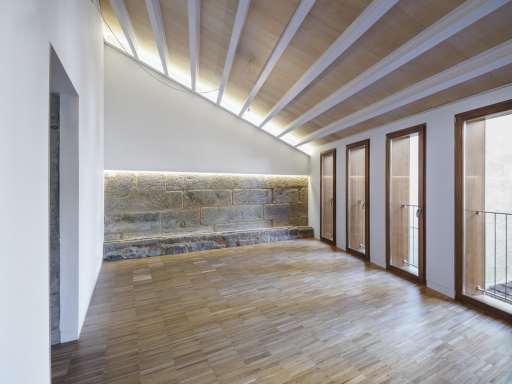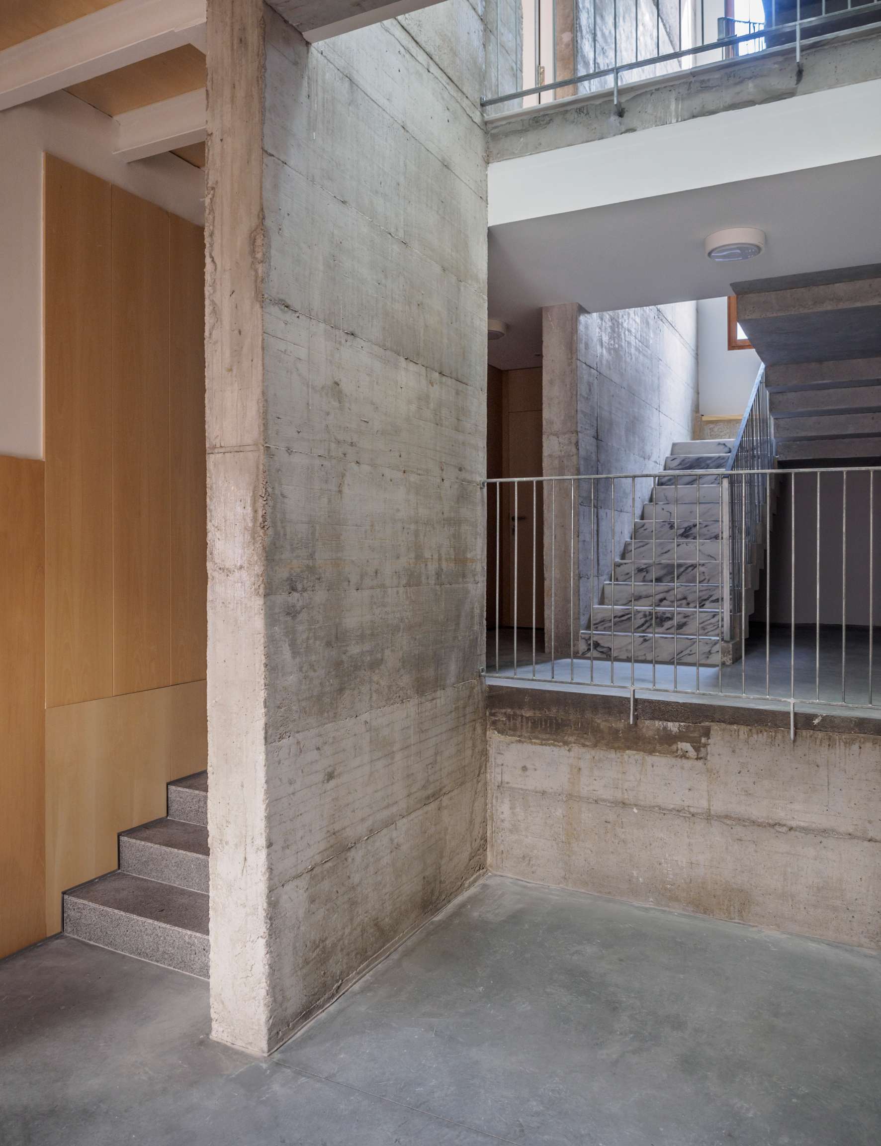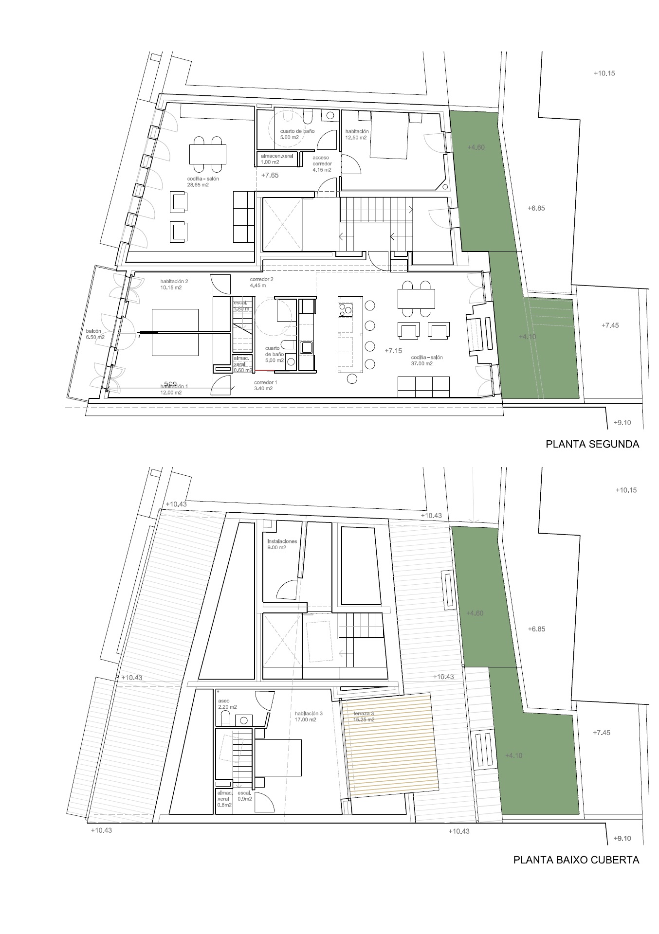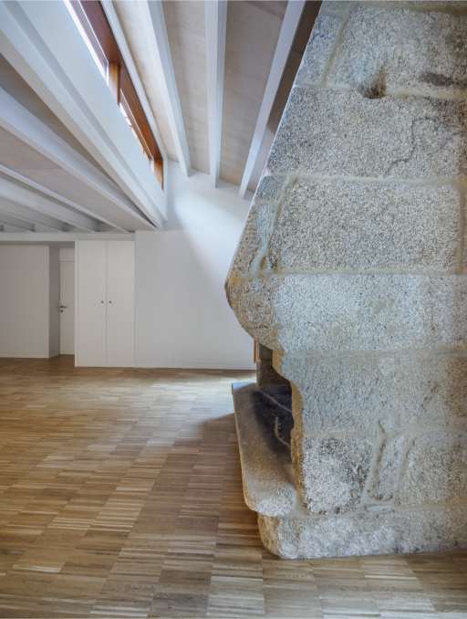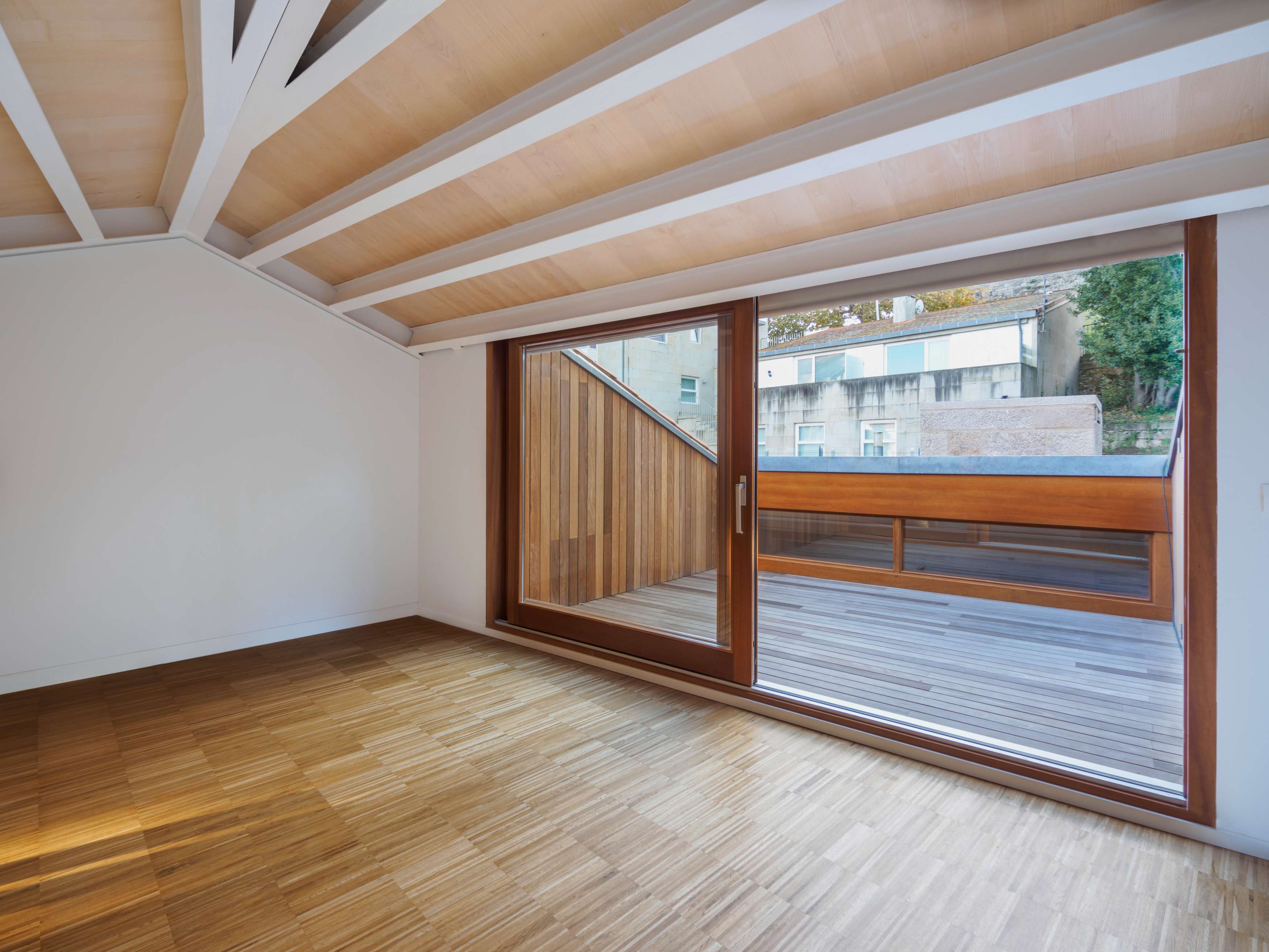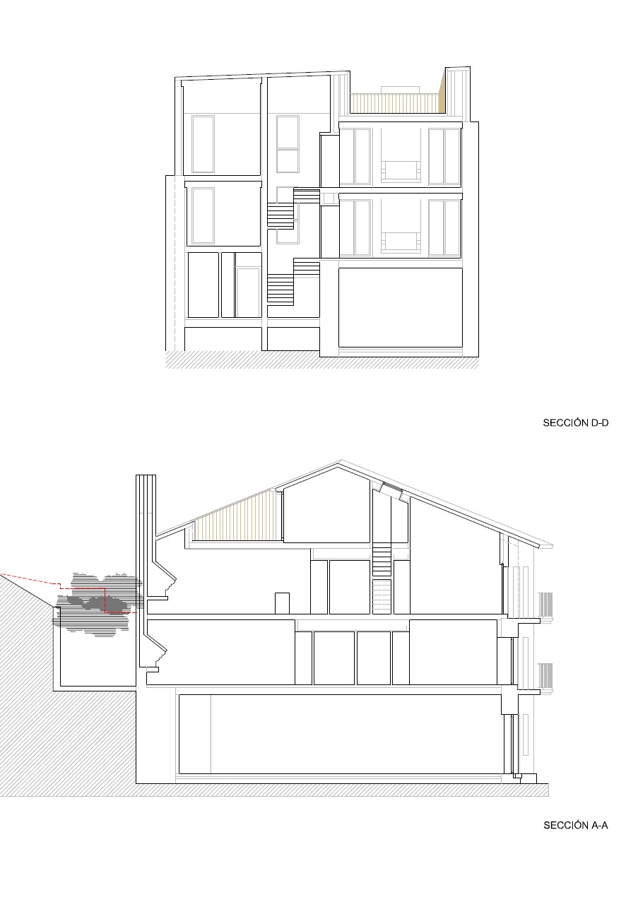 Dúas edificacións a restaurar, Ferrería 45 e 47, na parte alta do casco vello de Vigo, sobre a ladeira que, con gran pendente, encara o castelo de San Sebastián. Enclave que enterrou a planta baixa e primeira no fondo da parcela. Este é o punto de partida do proxecto, o principal problema a resolver. Decídeseescavar un patio inglés nese fondo para dar fachada ás vivendas: ventilación, luz e un espazo axardinado privado. Consérvase en Ferrería 47 chemineas senlleiras que, da man do patio recén nacido, van atraer cara a si a estancia principal da vivenda. Un local comercial e catro vivendas de un, dous e tres dormitorios que comparten os elementos de comunicación. Dúas edificacións con estados dispares de conservación; Ferrería 47 coa fachada, toda ela en pé; e Ferrería 45 soamente con media planta baixa e restos dun gran balcón soportado por ménsulas, darán lugar a dúas solucións diferentes de fachada. Unha recupera a súa imaxe orixinal, fachada de pedra con carpintaría enrasada ao exterior e parteluces; e outra reconstrúese ata o balcón de pedra, lugar onde se apoia a nova fachada máis lixeira, con carpintaría ao interior e xambeados vistos de madeira. O diálogo, a media voz, entre as dúas fachadas realizao un novo material, panel de cemento branco, de corte, cor e colocación similar a táboas de madeira. A fachada posterior de pedra precisa aumentar en altura e profundar no novo patio. Precisa tamén aperturas máis amplas. As chemineas axudan, na súa vertical, no soporte estrutural e na composición do alzado. O formigón de cemento branco e area de cor tostada, cun encofrado que continúa as xuntas das pedras, enlaza e completa a fachada. Os muros medianeiros existentes,de pedra,crecen en formigón cando non alcancen a cuberta. Algúns deles quedarán vistos no interior. Nace dende a cimentación un novo muro que soporta a escaleira e a través dela, o portal énchese de luz. Os forxados de madeira apóianse sobre as vigas metálicas vistase a madeira de faia cobre parte das paredes en continuidade coas carpintarías. Recupéranse pequenas presenzas do pasado. A canle de pedra de recollida da auga ten presenza no salón da vivenda e a gárgola traspasa a nova fachada.A fermosa porta de Ferrería 47restáurase eabre agora ao local comercial na planta baixa.