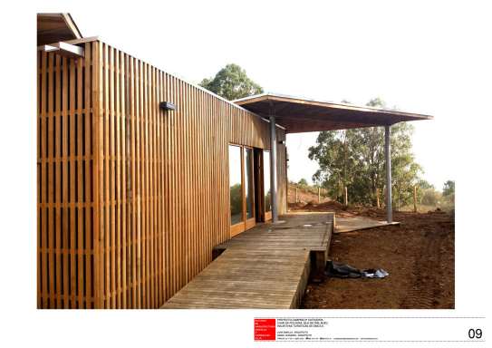 Enlistonado exterior en madera de duramen de eucalipto con corte radial, atornillado a rastreles de la misma madera en fachada exterior e interior de los módulos y empalizadas de cierre de patios.