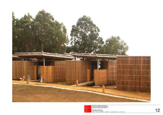 mediante pérgolas de madera que son base a la vez de los sistemas de paneles fotovoltaicos y de los paneles de producción de acs solar, consiguiendo además un impacto nulo de estas instalaciones en el recinto y en la propia isla.