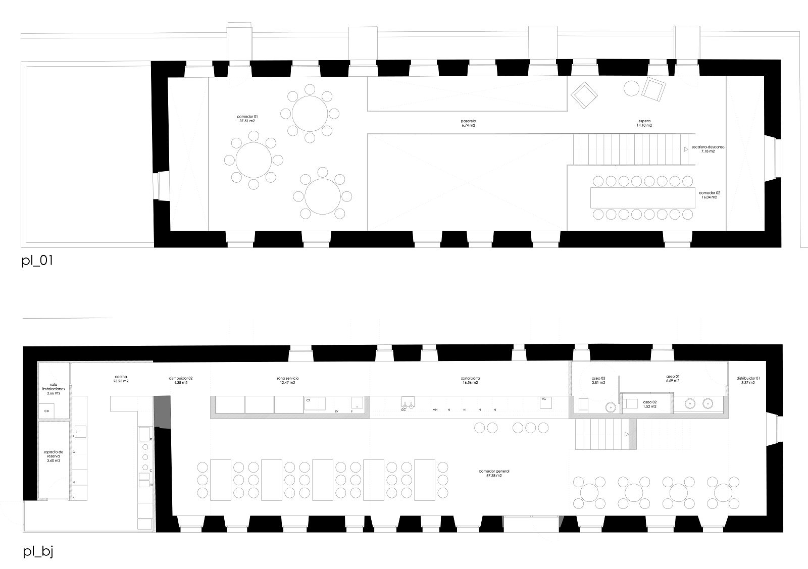 La actuación, que parte de un presupuesto muy reducido, propone respetar la potencia de los huecos del alzado actuando en el interior del inmueble. Un único elemento consistente en una lámina de hormigón que se va plegando genera los diferentes espacios y usos necesarios para configurar el restaurante. Esta lámina plegada creará los recorridos, aseos, barra y zonas de servicio en planta baja. El segundo pliegue, en perpendicular al anterior, hará que esta lámina se convierta en los forjados que formarán los dos comedores en planta alta.