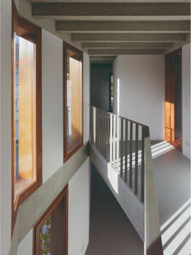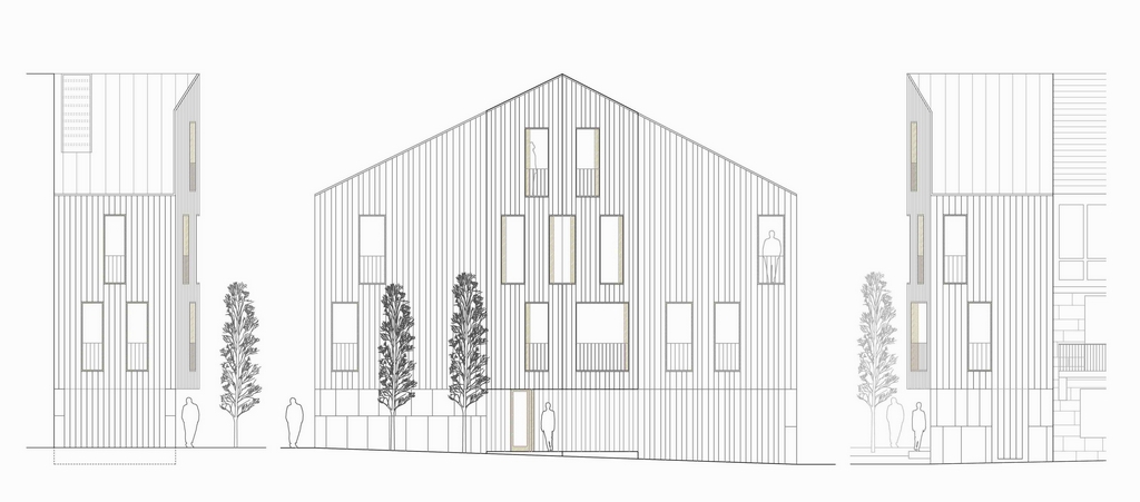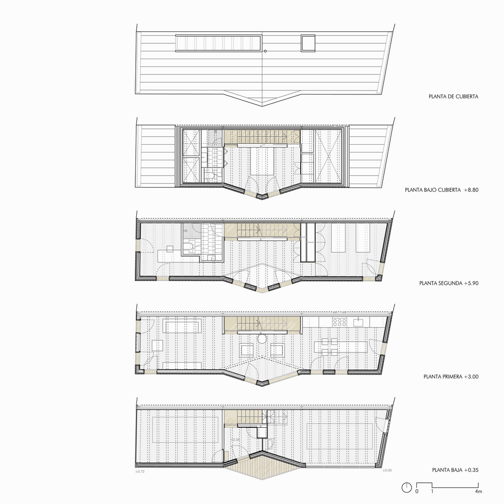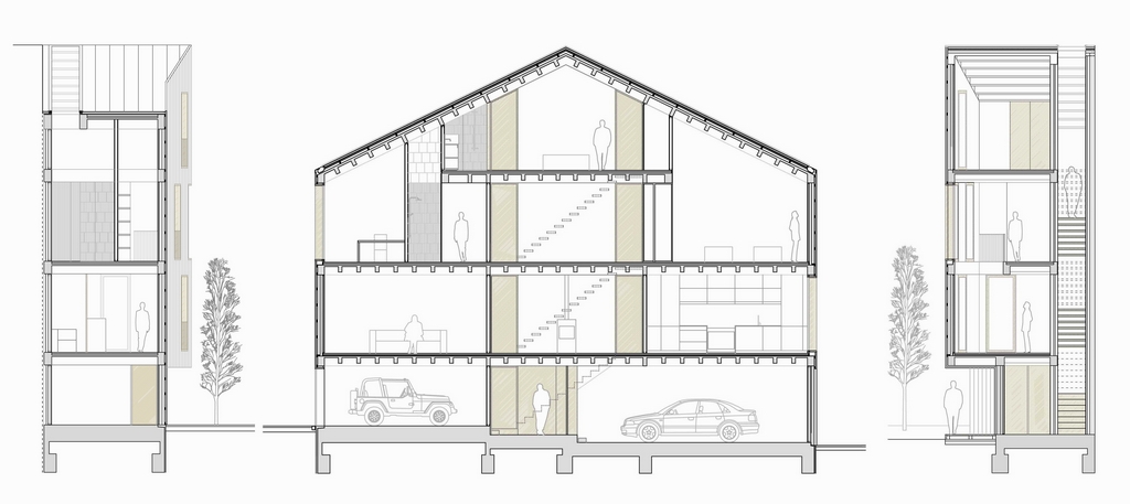 Hacer un planteamiento sencillo basado en la dimensión longitudinal de un espacio diáfano y en la centralidad de los accesos. La escalera, arrimada a la medianería, deja estancias a cada lado, mientras la fachada, en su parte central, le hace sitio como saliente en plantas altas o la aproxima como entrada a cubierto en el acceso principal. Las alturas dobles y las estrechas ventanas-balcón, relacionan las plantas entre sí y el espacio exterior, sin llegar a mostrarlo todo.