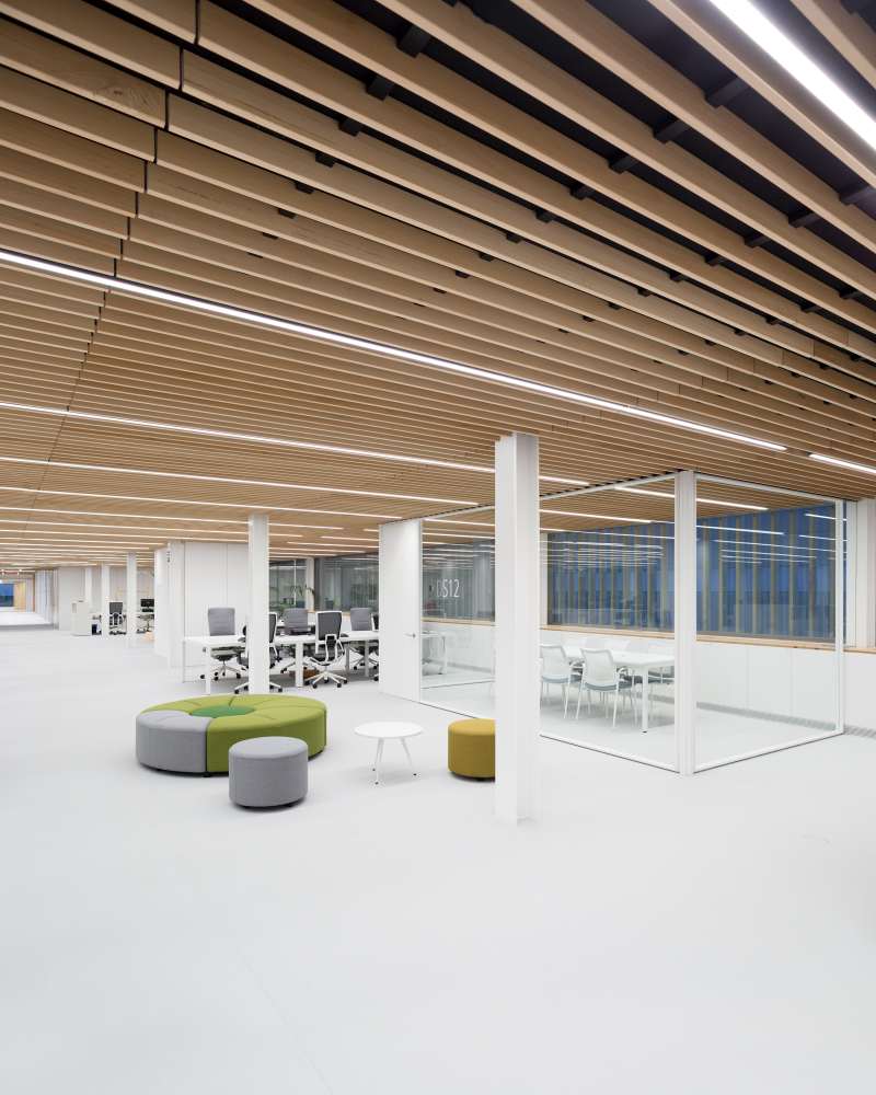 Funcionalmente, o edificio organiza as zonas de traballo en distintas áreas de planta libre ou aberta, articuladas ou segmentadas puntualmente por núcleos de comunicación, cabinas de videoconferencia e salas de reunións. Nun extremo da planta baixa sitúanse as áreas máis singulares coas dependencias do consello e dirección da empresa, así como o servizo médico. O edificio de acceso ou de conexión non alberga postos de traballo nin áreas departamentais. Na planta baixa sitúase o vestíbulo e un espazo polivalente a modo de «caseta». A planta primeira protagonízaa unha gran «praza» delimitada por diversas salas de reunións como punto de encontro de todas as áreas de oficinas.